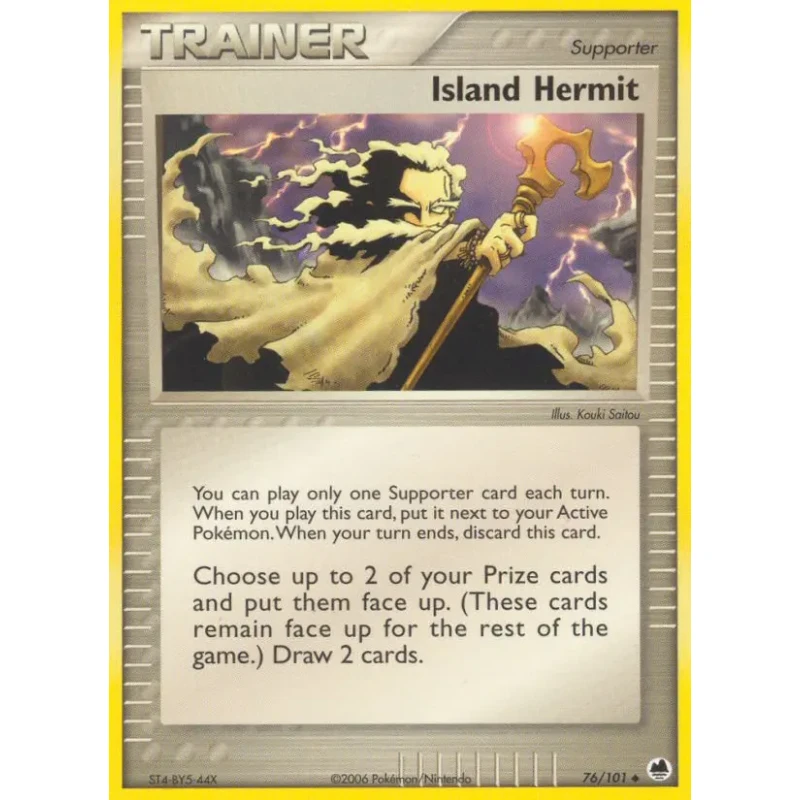 Island Hermit Trainer card from the Dragon Frontiers set (#76/101). Illustrated by Kouki Saitou. Released in 2006 by Pokémon/Nintendo. This card is a foil variant and is a Supporter type Trainer card. It allows the player to reveal up to 2 of their Prize cards and draw 2 cards. Useful for both collectible and casual play. Card code ST4-BY5-44X.