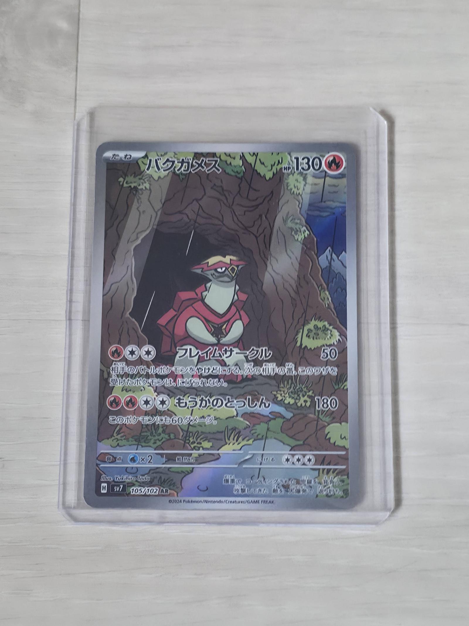 This is a Japanese language Art Rare card. It is card number 105/102 from the SV7 set, illustrated by Yukihiro Tada. Sleeved and Toploadered after pulled.