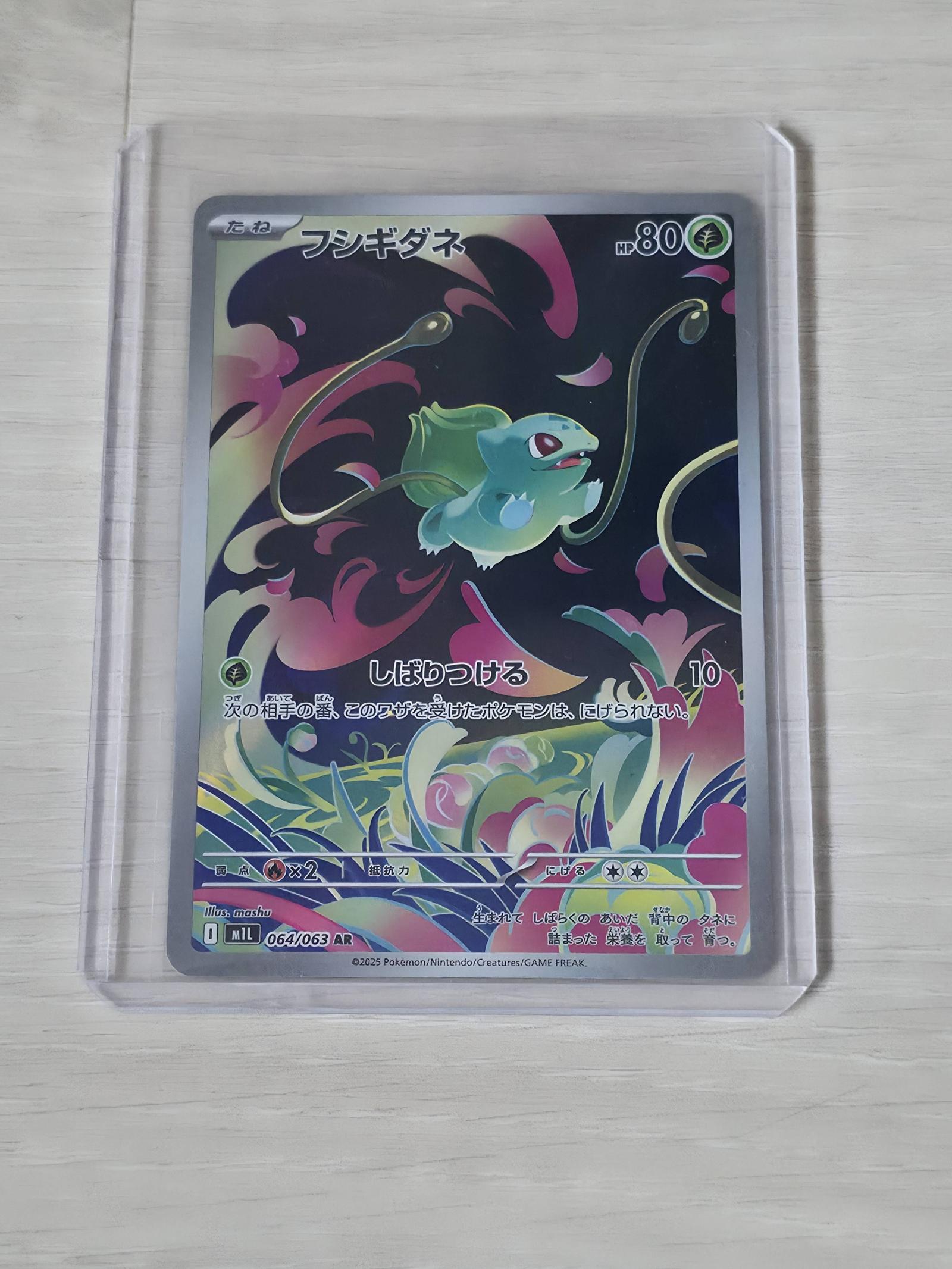 Japanese Bulbasaur (フシギダネ) from the 2025 Pokemon set, card number 064/063 with Alternate Rare (AR) printing. Illustrated by mashu. This card features unique artwork and is foil. It is a collectible item. Sleeved and Toploadered after pulled.