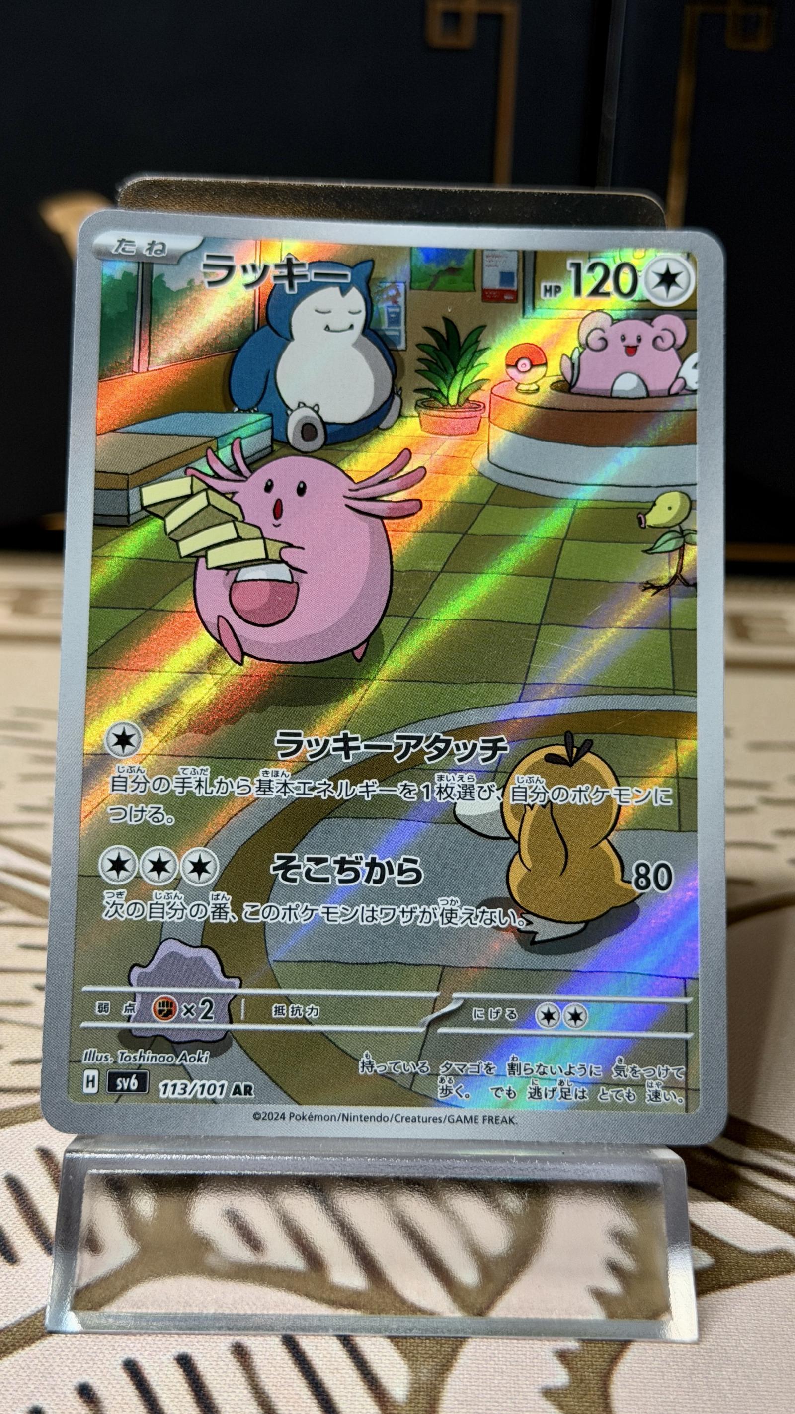 This is a Japanese Pokemon TCG card featuring Chansey (ラッキー) with the artist Toshinao Aoki. The card is from the Scarlet & Violet (SV6) set, numbered 113/101, indicating it is a secret rare alternate art (AR) card. Printed in 2024, it shows a beautiful full-art style with foil treatment. The card is collectible and playable in the current meta. The language code is Japanese. Card code is 113101. The card is foil with an alternate art design.