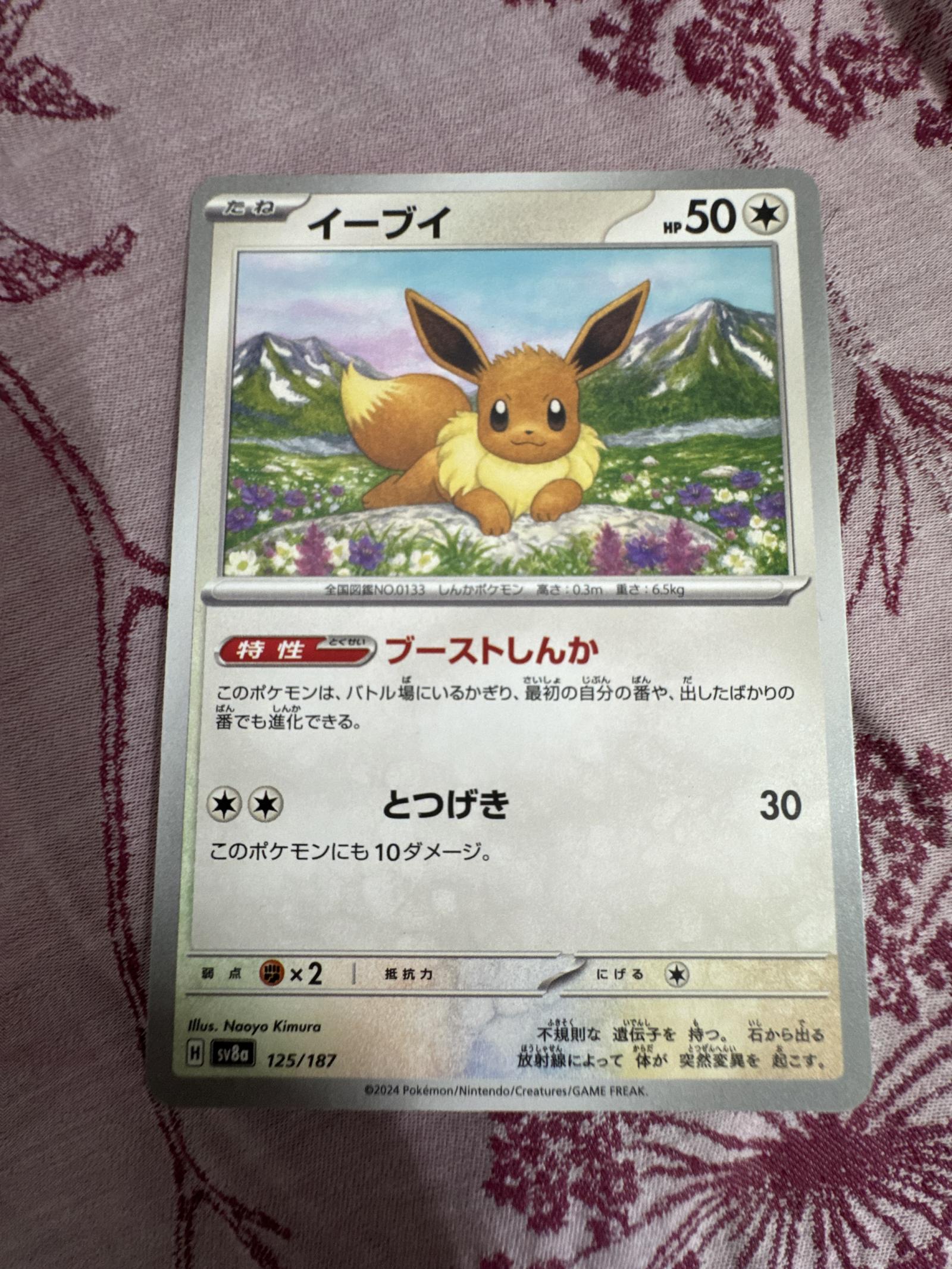 Eevee card from the SV8a set, card number 125/187. Illustrated by Naoyo Kimura. This is a normal, non-foil Japanese Pokemon card. Playable in the current meta as a basic Pokemon with useful abilities and attacks. Card code: 125/187.