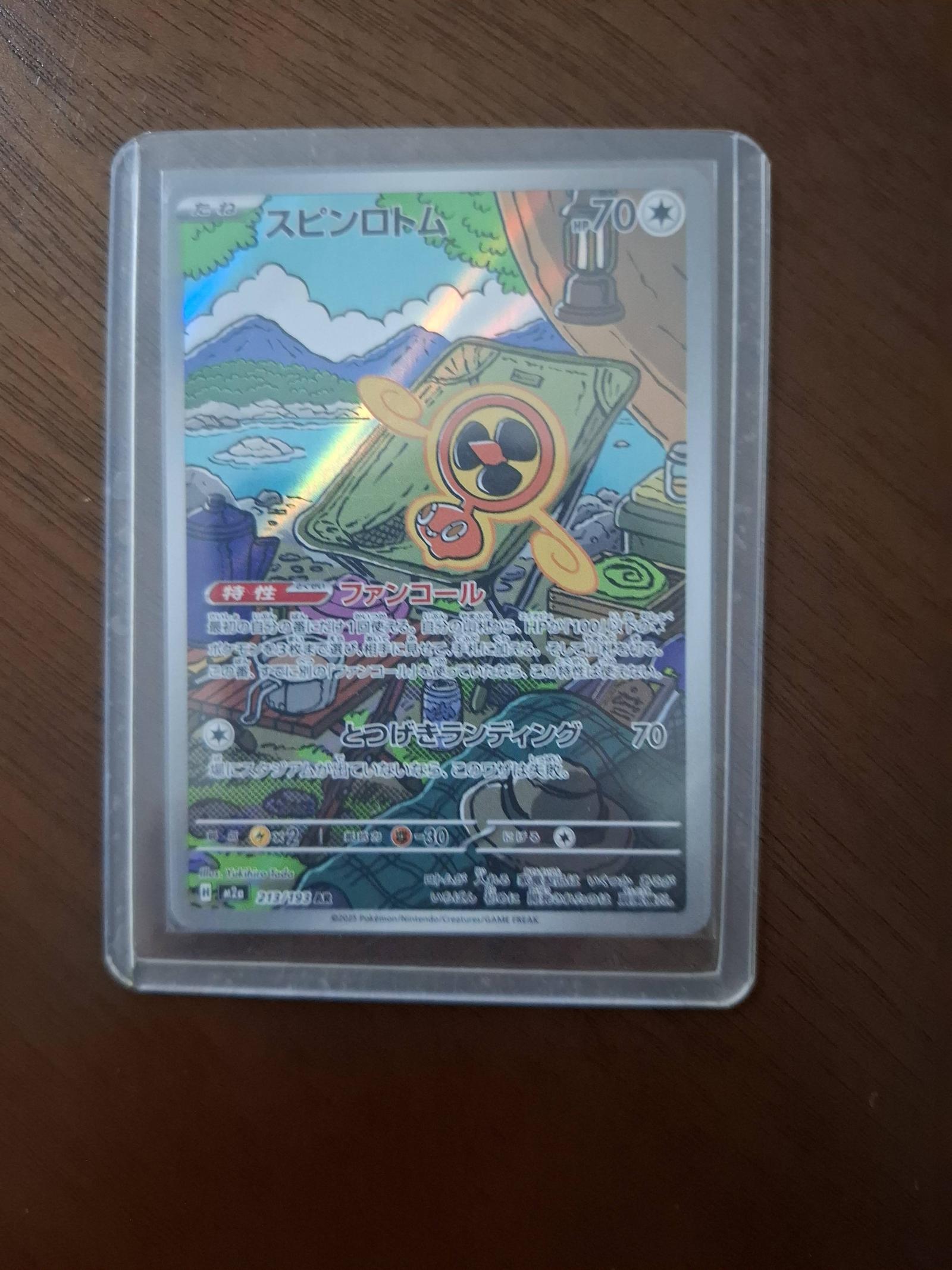 Japanese holo Fanfare Rotom (スピンロトム) from Pokemon TCG set AR (Alternate Reality) card number 227/198. The card features a beautiful campsite artwork by artist Ken Sugimori. It is a foil holographic card playable in the Pokemon TCG meta with a special alternate art. The card is in Japanese language.