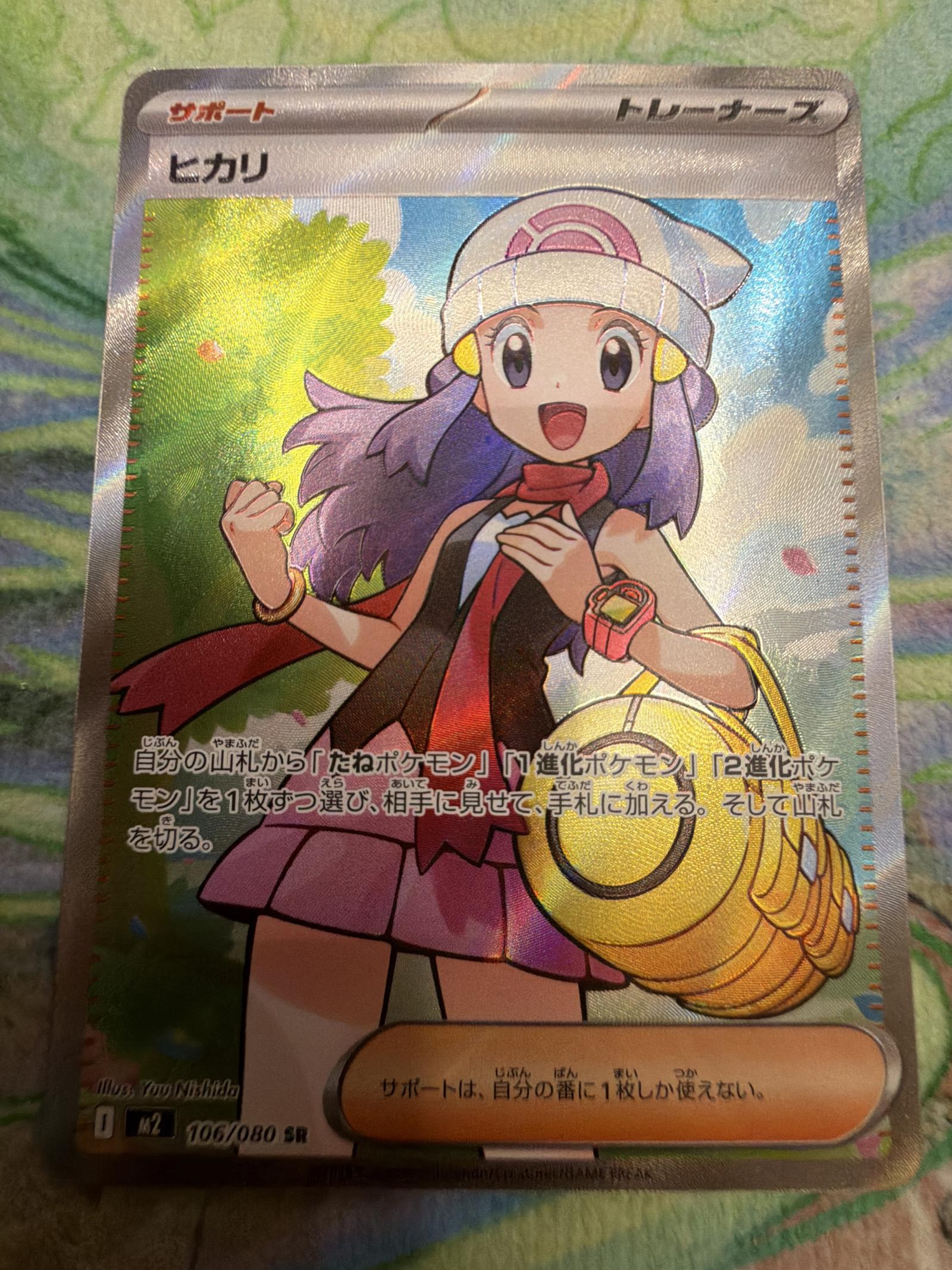 This is a Japanese full art Trainer card featuring Hikari (Dawn) from the Pokemon TCG set M2, card number 106/80 SR. The card is foil and illustrated by 7uo Nishida. It is a collectible card with a secret rare printing treatment, popular among collectors for its artwork and rarity.