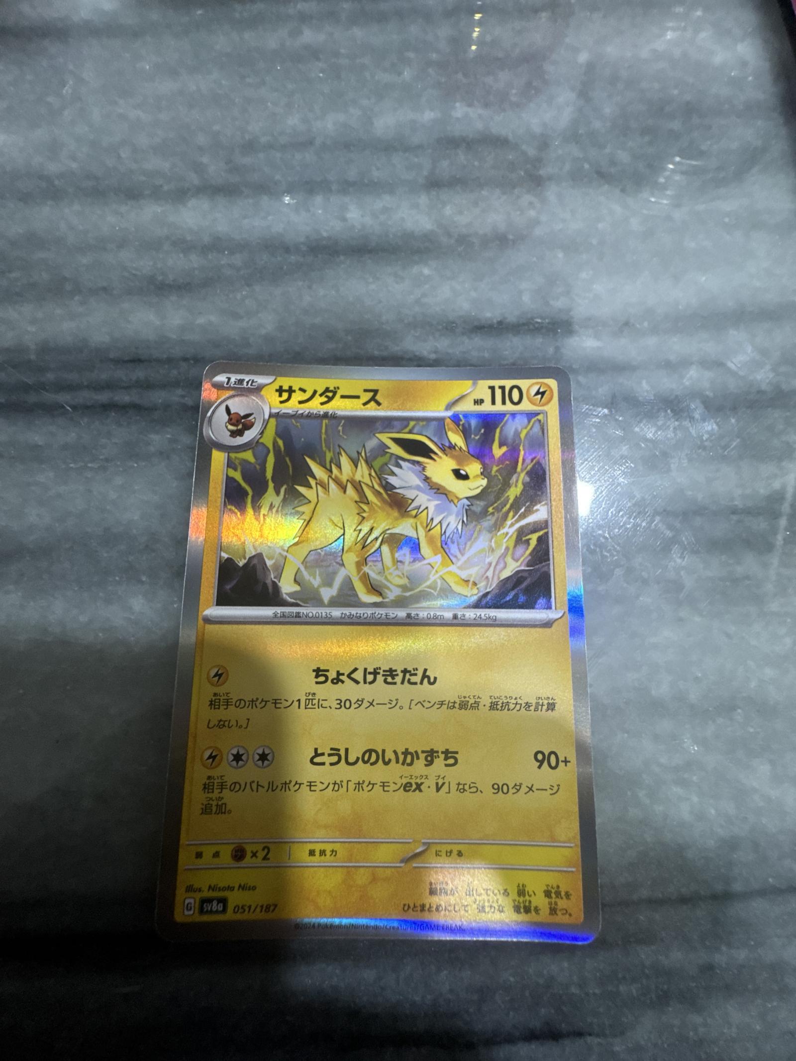 This is a Japanese Jolteon Pokémon card Card number 051/187, illustrated by Ninoie Nizo. The card features holofoil treatment. It is a collectible card with playable potential in the Pokémon TCG meta.