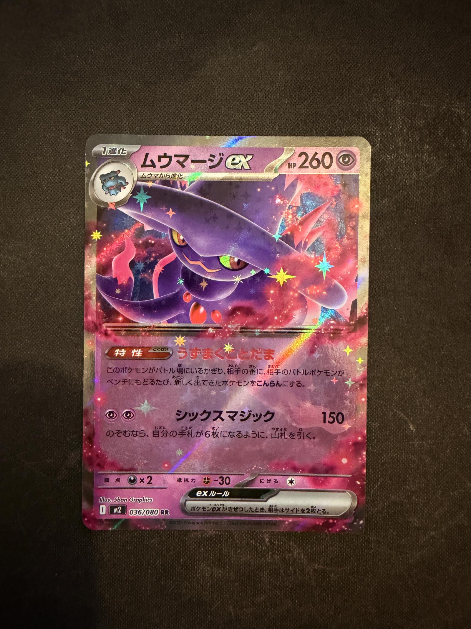This is a Japanese Mismagius ex card, number 036/080, from the Pokemon set with set code M2. The card is illustrated by 5ban Graphics and has a holographic foil finish. It features 260 HP and psychic-type attacks. As an ex card, it has competitive play potential. The card code is 036/080. The language is Japanese.