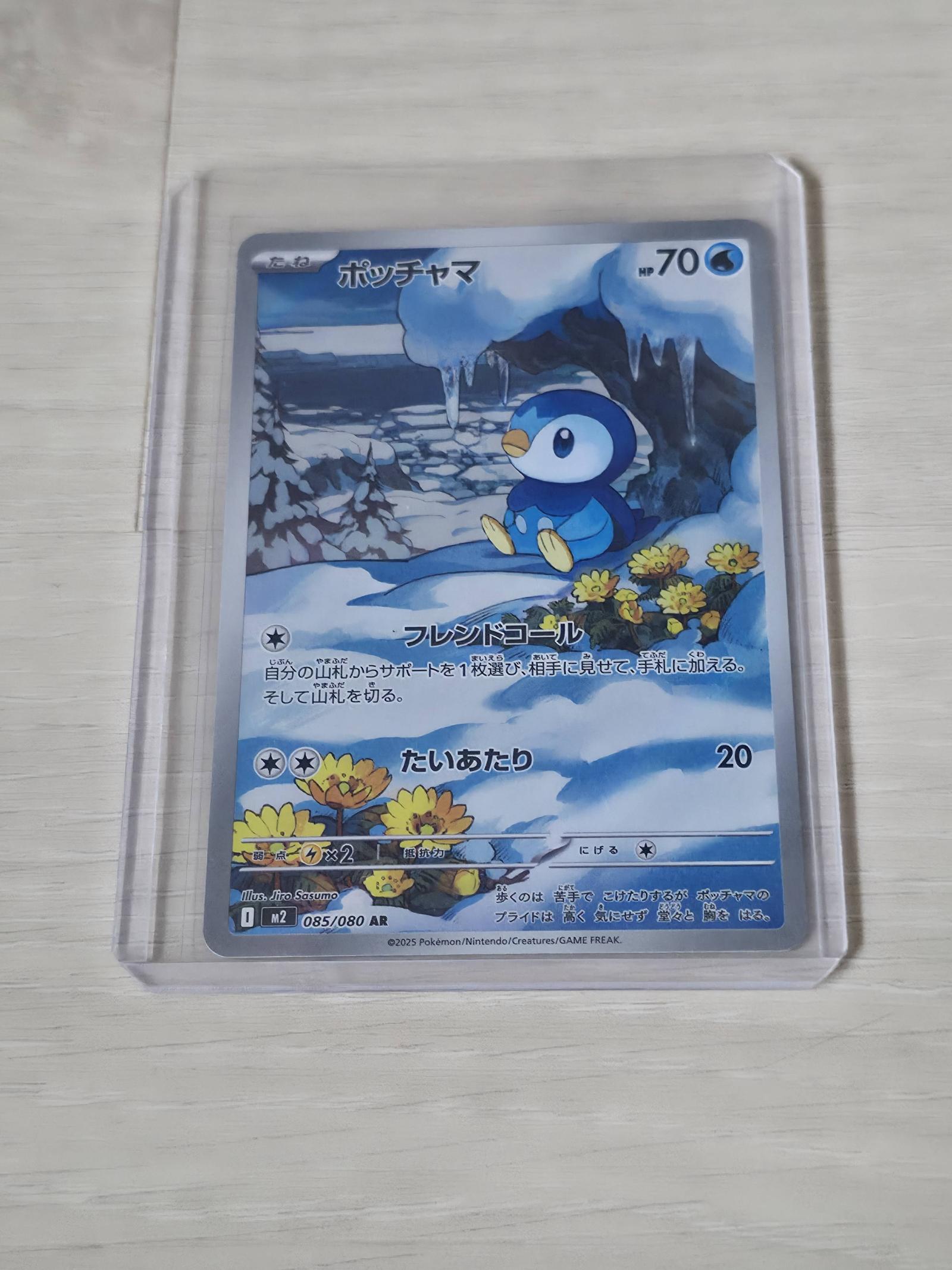 Pokemon TCG card featuring Piplup (ポッチャマ) with the collector number 085/080 AR from the M2 set. Illustrated by Jiro Sasumo. This card is a reverse holo (AR) from a Japanese release. The card is mainly collectible and popular in modern set. Sleeved and Toploadered after pulled.