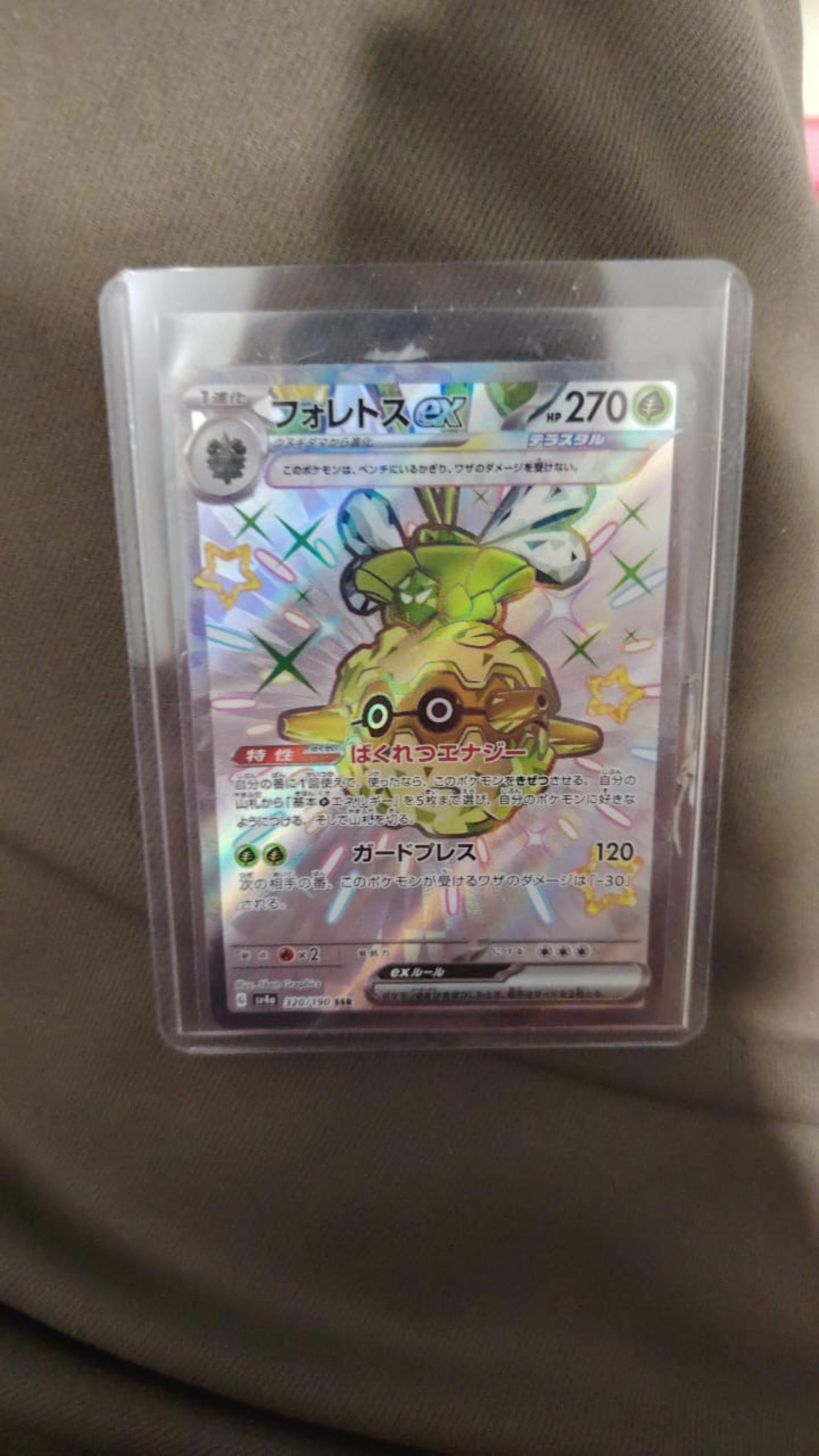 A holographic Japanese Forretress EX card from the Pokemon series with 270 HP, featuring the moves and abilities in Japanese text. The card is encased in a protective sleeve. This is a collectible trading card but not related to soccer.