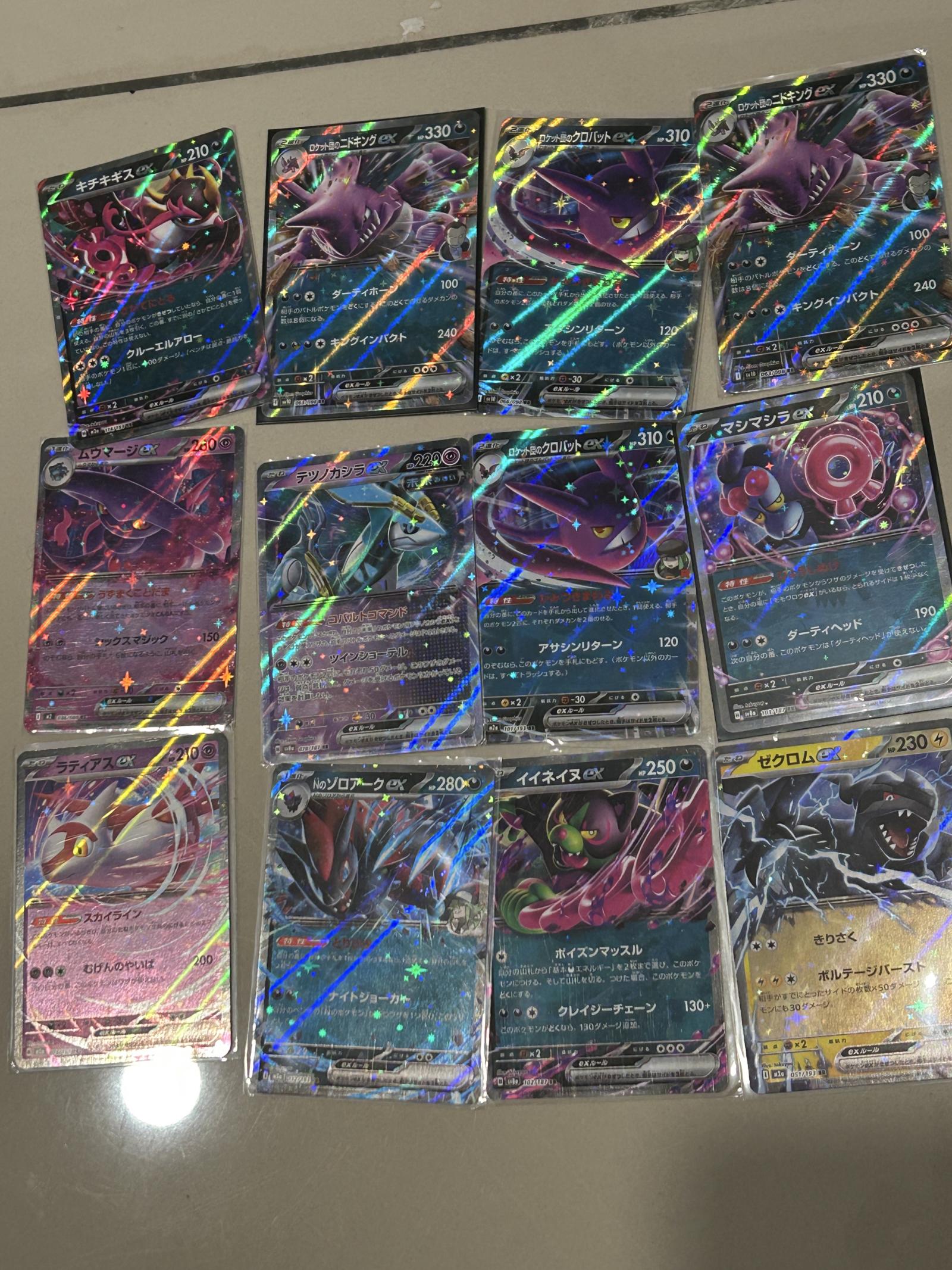 A collection of Japanese Pokémon TCG EX and GX holofoil cards featuring popular Pokémon like Houndoom ex, Crobat ex, Weavile ex, and Zekrom. Includes cards from various sets in Japanese with beautiful holographic effects. Cards are playable in the Pokémon TCG meta and are highly collectible due to their holo treatment and EX/GX rarity. Exact card codes and artists vary by card; set names and full details are not fully visible. Language: Japanese. Condition and authenticity assumed good but not graded.