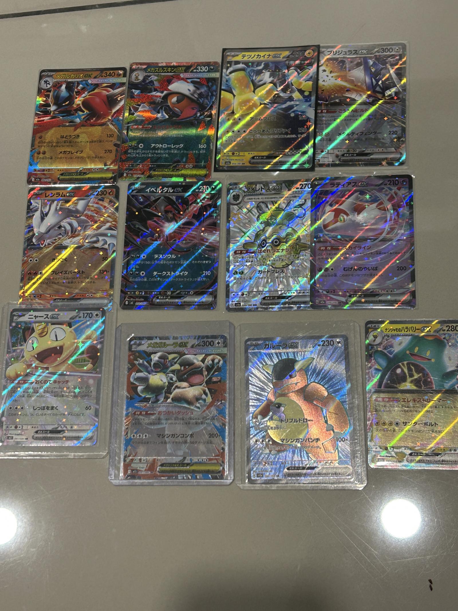 Lot of 11 Japanese Pokémon TCG cards including full art, holo, GX and EX cards featuring powerful and collectible Pokémon like Mega Gallade EX, Mega Sableye EX, Dialga GX, Primal Groudon EX, Reshiram GX, Yveltal EX. Cards are foil and some have collector’s numbers and artist credits. These cards are desirable for collectors and some playable in meta. Cards come from multiple sets with Japanese text. Includes rare holo and reverse holo treatments.