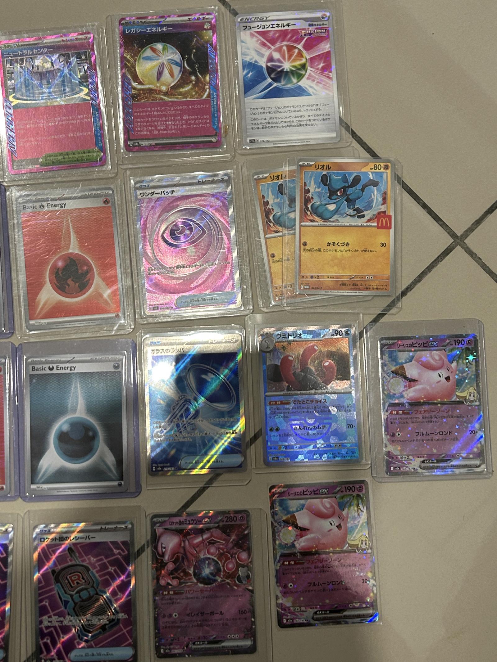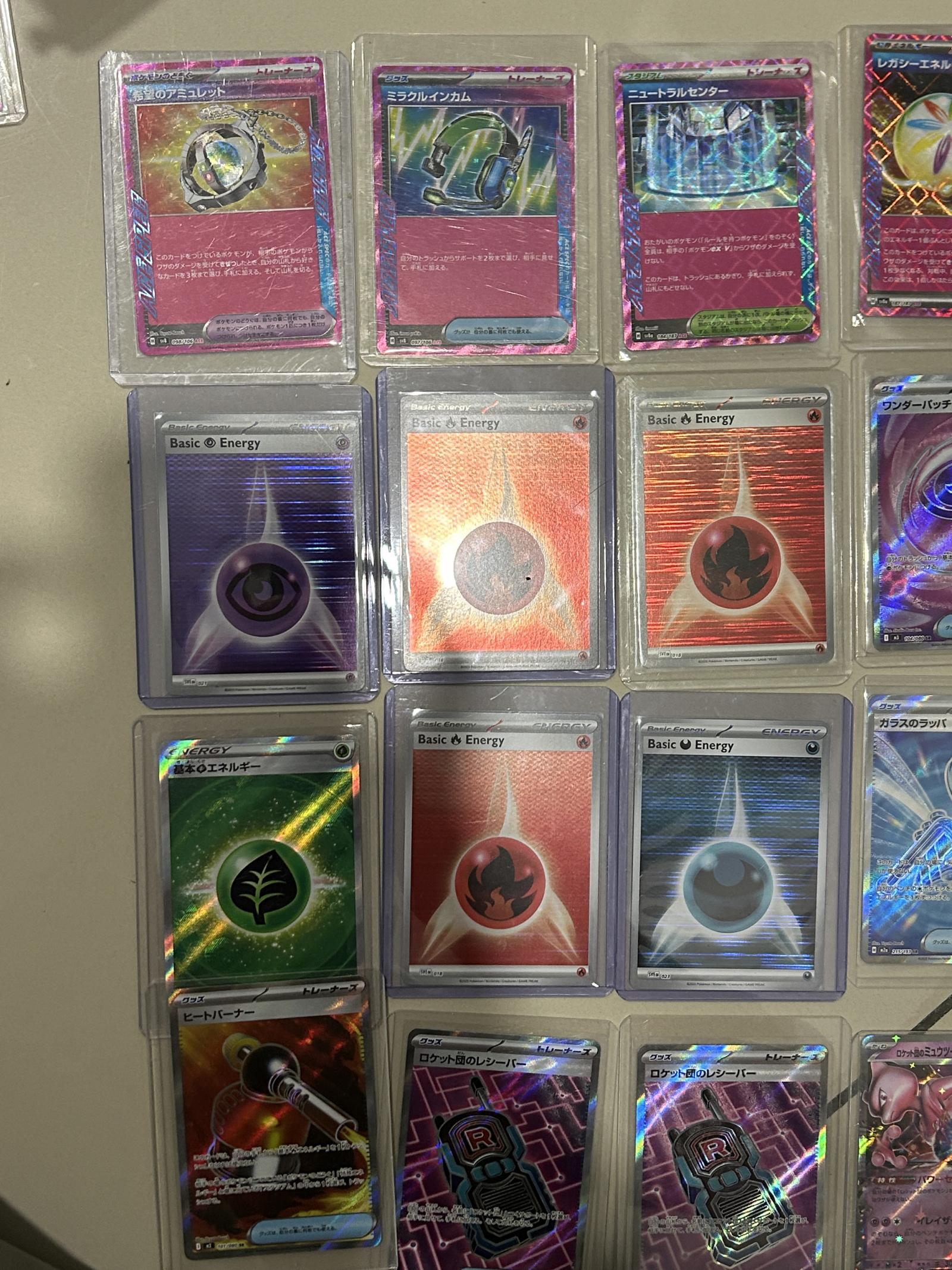 A collection of Japanese Pokemon TCG cards featuring various Trainer and Basic Energy cards. Includes cards from different sets with holo and reverse holo printings. Notable cards include Rocket Grunt Trainer, Basic Energy cards of various types, and Miracle Incense, all with unique Japanese artwork. Cards are in protective sleeves, suitable for collectors and some may be playable in certain formats. Card details vary; no specific card number, set code, or artist info available.