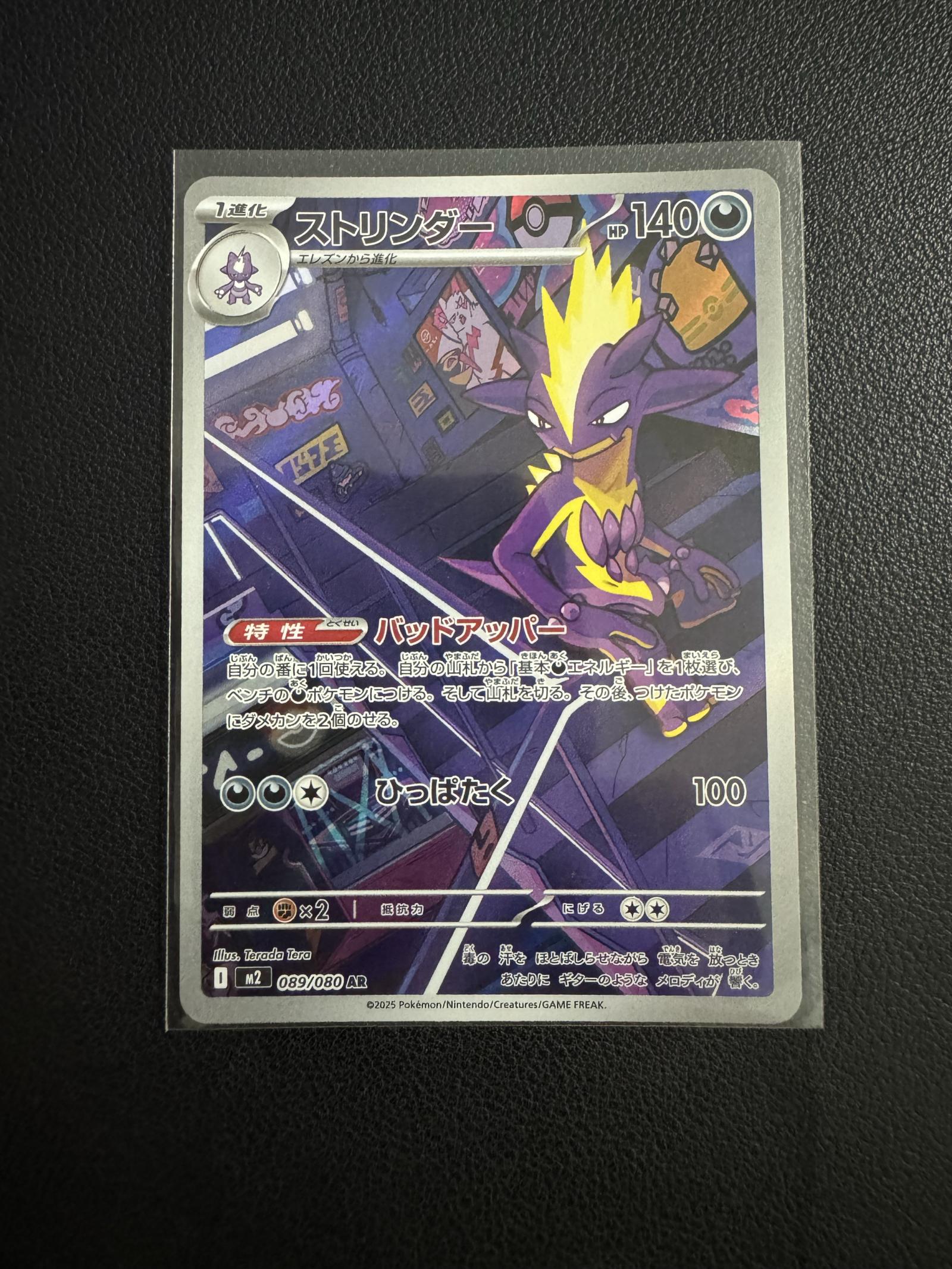 This is a Japanese Stringder (known as Toxtricity in English) card from the M2 set of the Pokemon TCG. The card number is 089/080 AR. The artist is Terada Ikeno. It has 140 HP and features a distinct anime-style artwork set in an urban background. The card is holographic (AR - Alternate Rare). Language is Japanese. It is a collectible card playable in the Pokémon TCG with good utility.