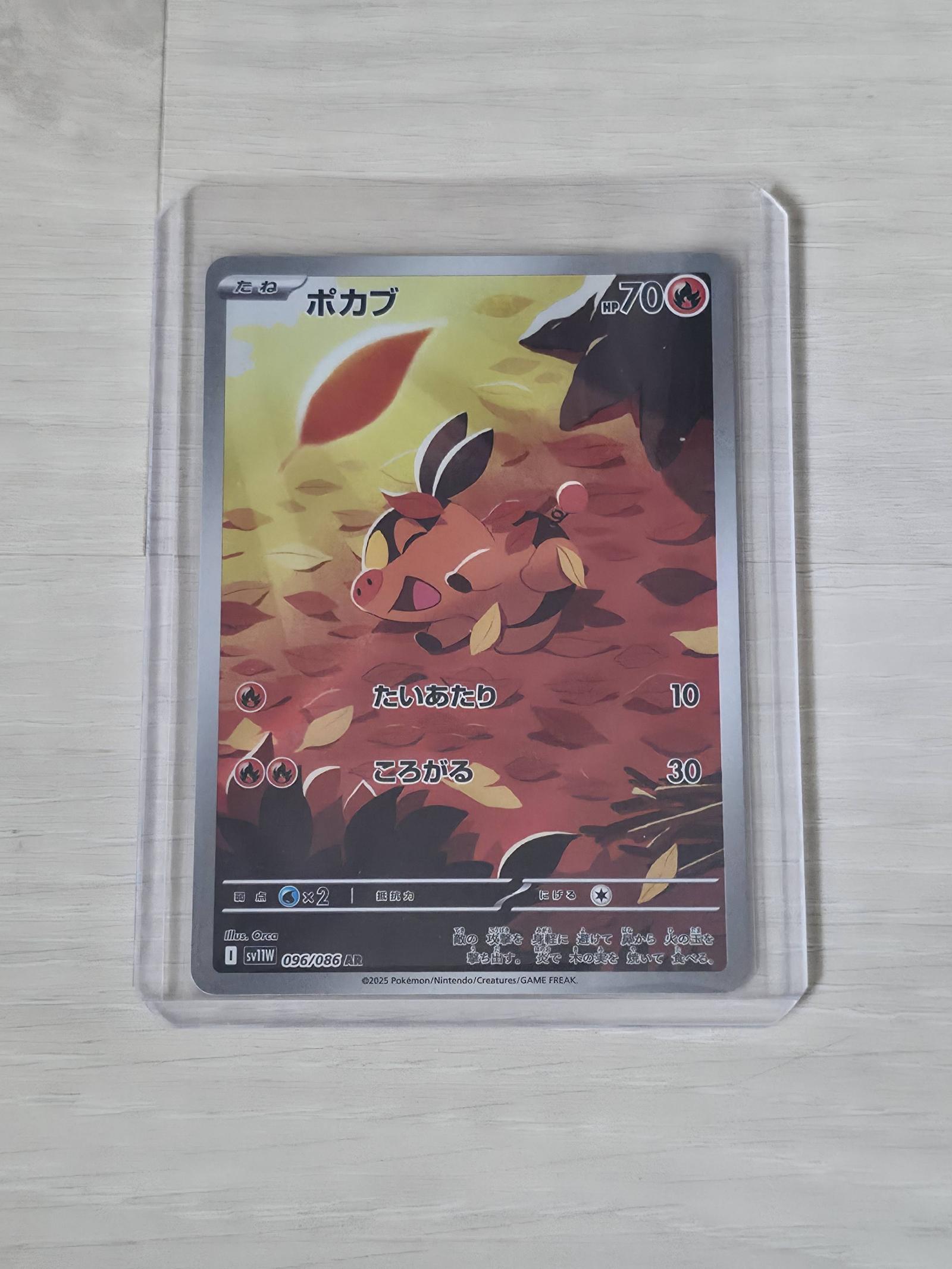 Japanese Tepig card from the Scarlet & Violet (SV11W) set, card number 96/086. A popular Art Rare card with the illustration. Sleeved and Toploadered after pulled.