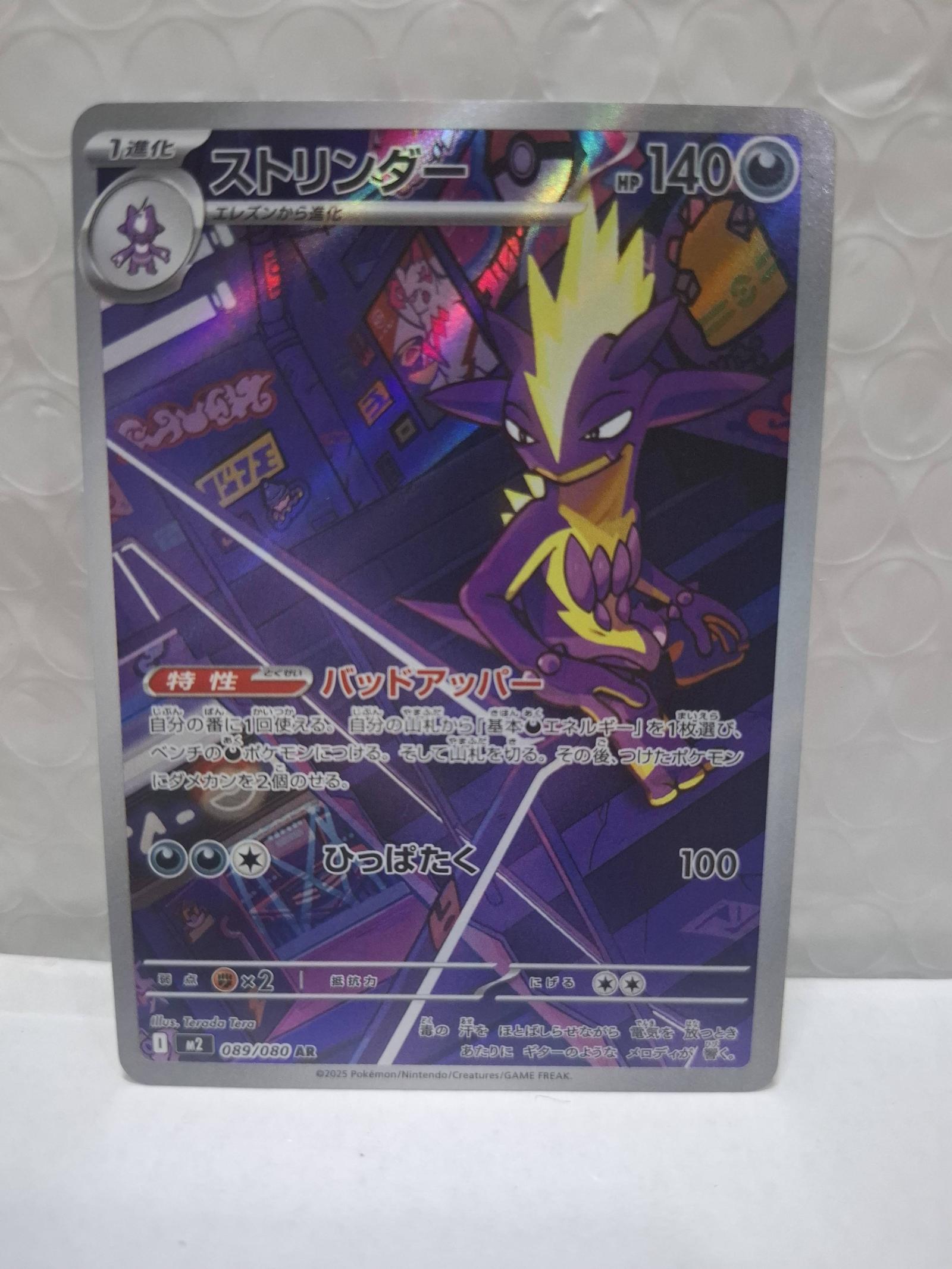 Japanese Pokémon TCG card Toxtricity V (ストリンダー) from the Evolving Skies set. Card number 089/080 AR. Alternate Art featuring artwork by Tetsuya Taro. This is a reverse holo foil card. Playable in the current meta for Pokémon TCG. Card language is Japanese.