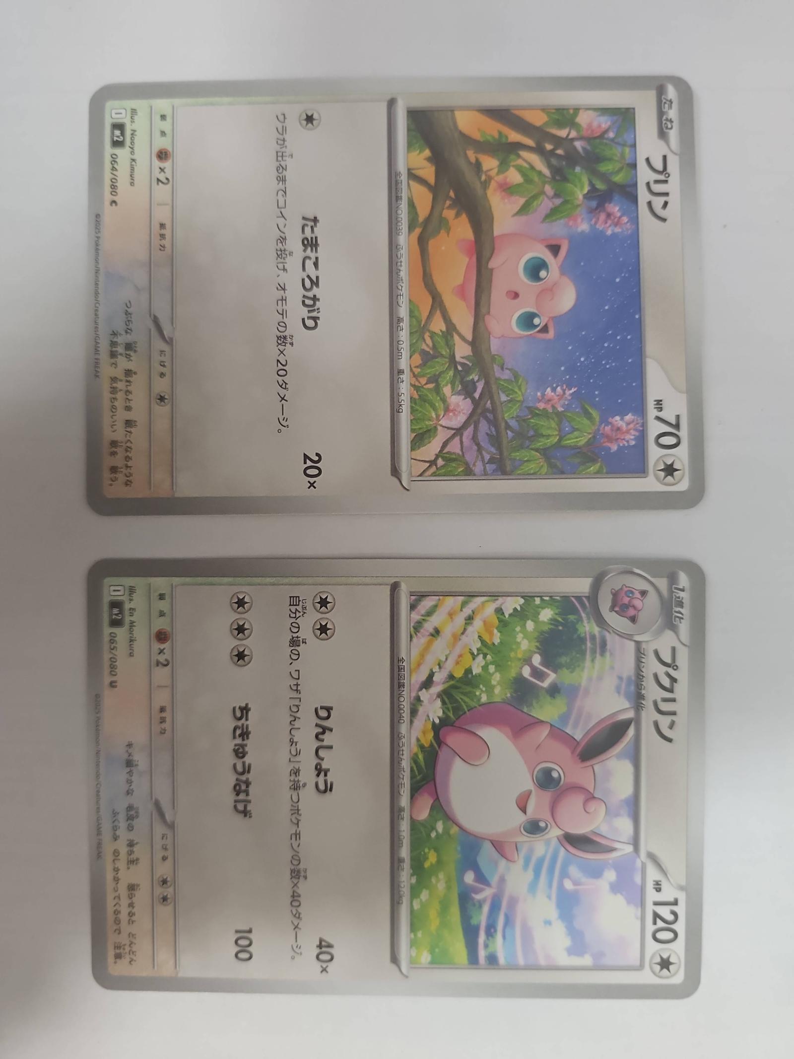 Two Japanese Pokémon cards featuring Jigglypuff (プリン) HP 70 and Wigglytuff (プクリン) HP 120. Both cards are from a set with codes 064/080 and 065/080 respectively, marked with a 'U' set code and printed in Japanese (language code: jp). The cards show basic and evolved forms with artwork depicting the Pokémon in natural settings. The cards are in normal printing treatment, without foil or special rarity aspects mentioned.