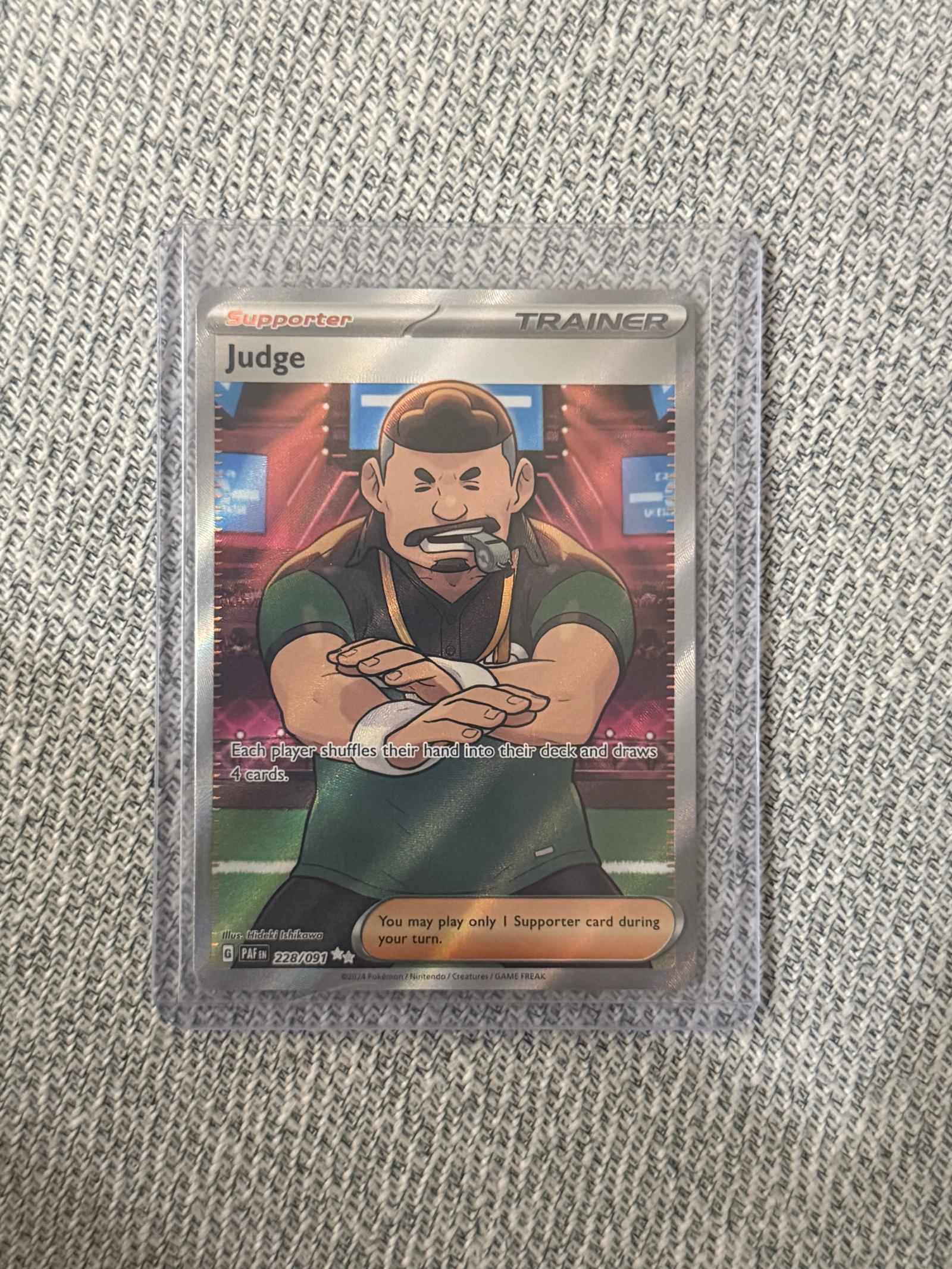 Judge full art Trainer Supporter card from the PAF set, card number 228/091. Artist: Hideki Ishikawa. English language. This card is foil and part of the Pokemon TCG. A supporter card playable in the meta with special full art printing treatment.