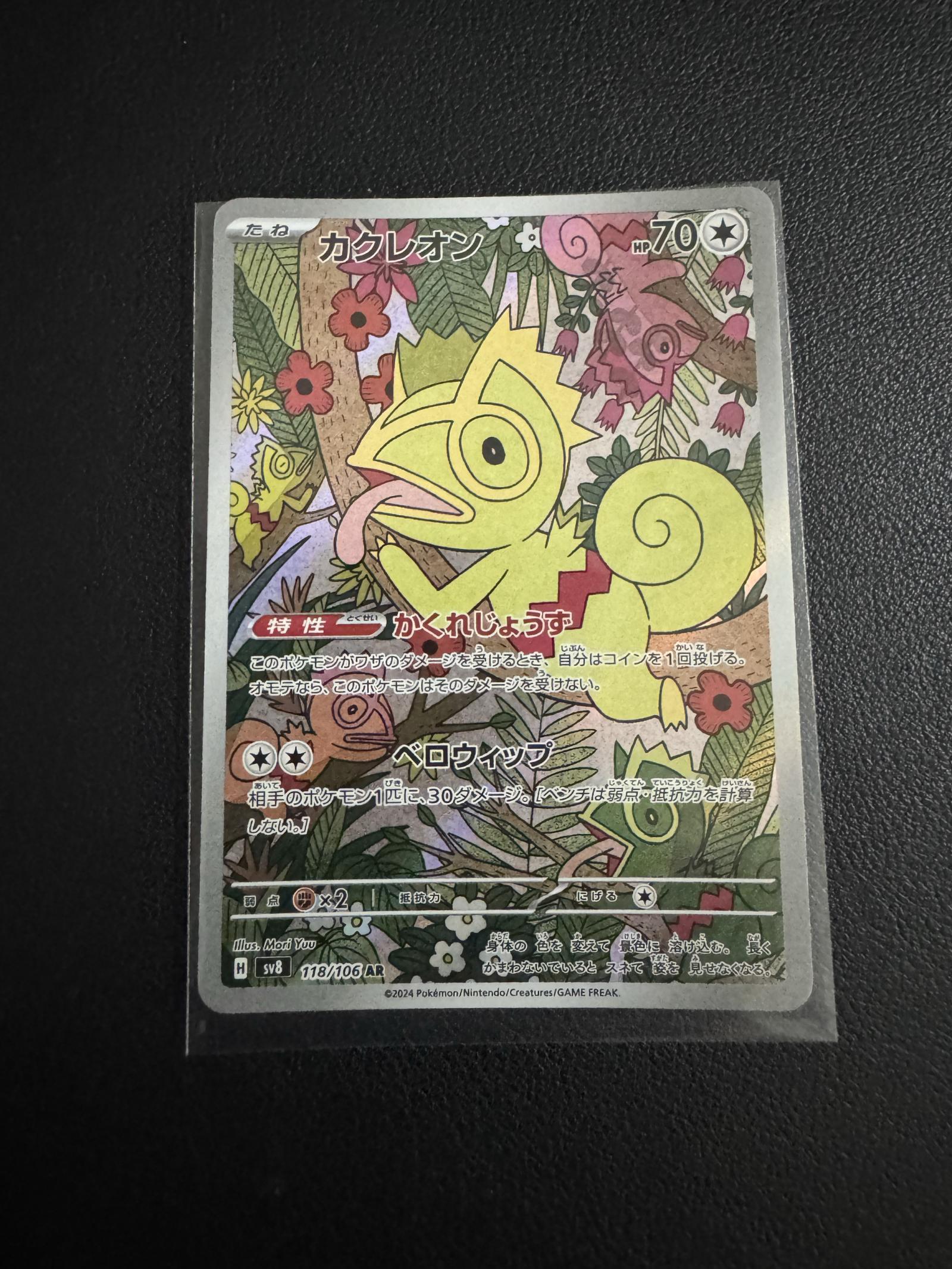 Japanese Kakureon (Kecleon) card from the Scarlet & Violet Accelerate (SV8) set. Card number 118/106 with alternate art (AR). Illustrated by Mori Yuu. This card is an alternate rarity foil version and part of the 2024 set. Playability in competitive meta is limited, mainly of interest to collectors due to its unique art and rarity.