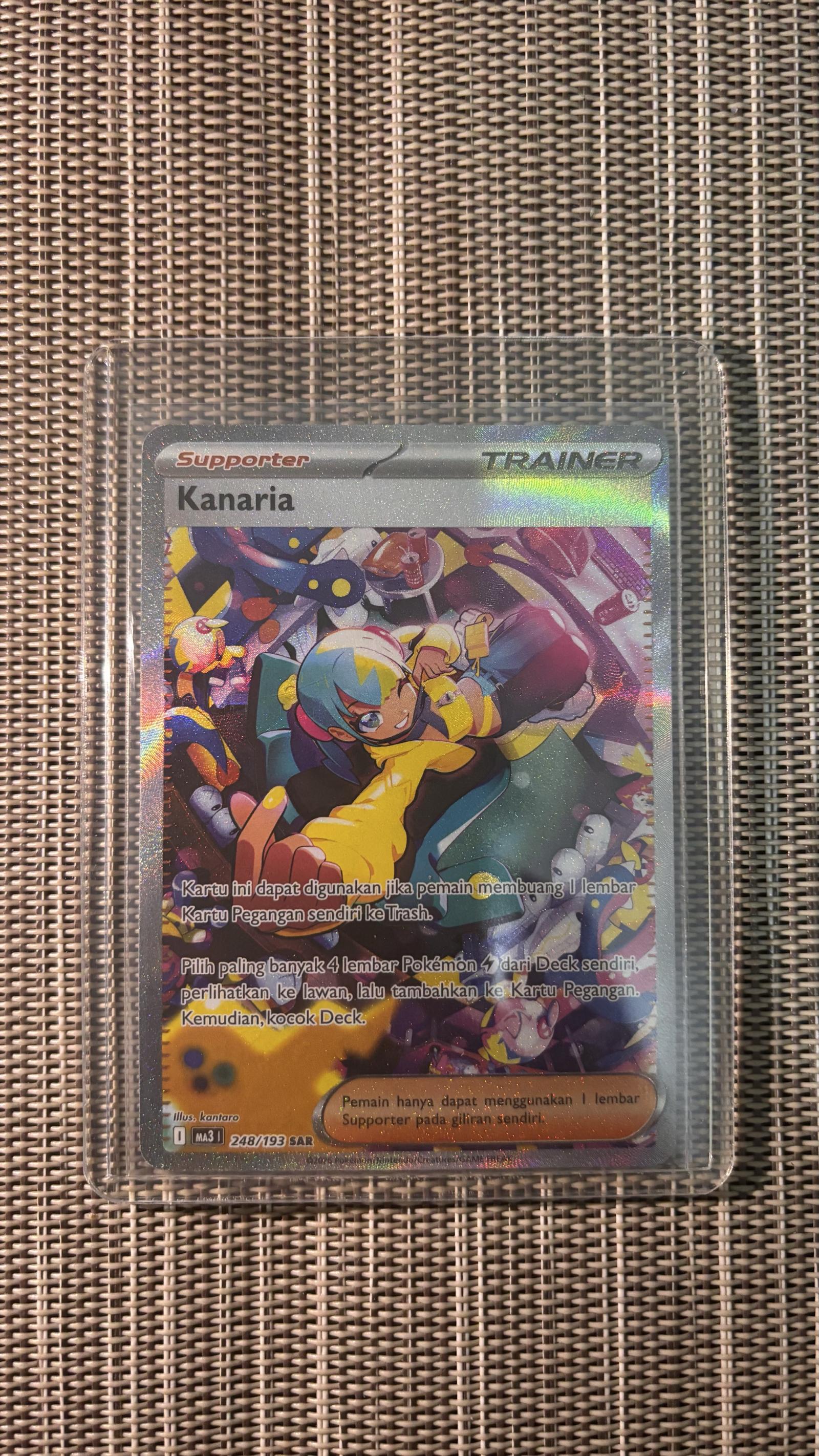 Kanaria Full Art Trainer Supporter card, card number 248 from set SAR. Card code MA3 248/193. Illustrated by kantaro. This Indonesian language foil card is a Secret Rare (SAR) from its set. Playable supporter card useful in decks that involve Electric-type Pokémon. A collectible and strategic card for players and collectors alike.
