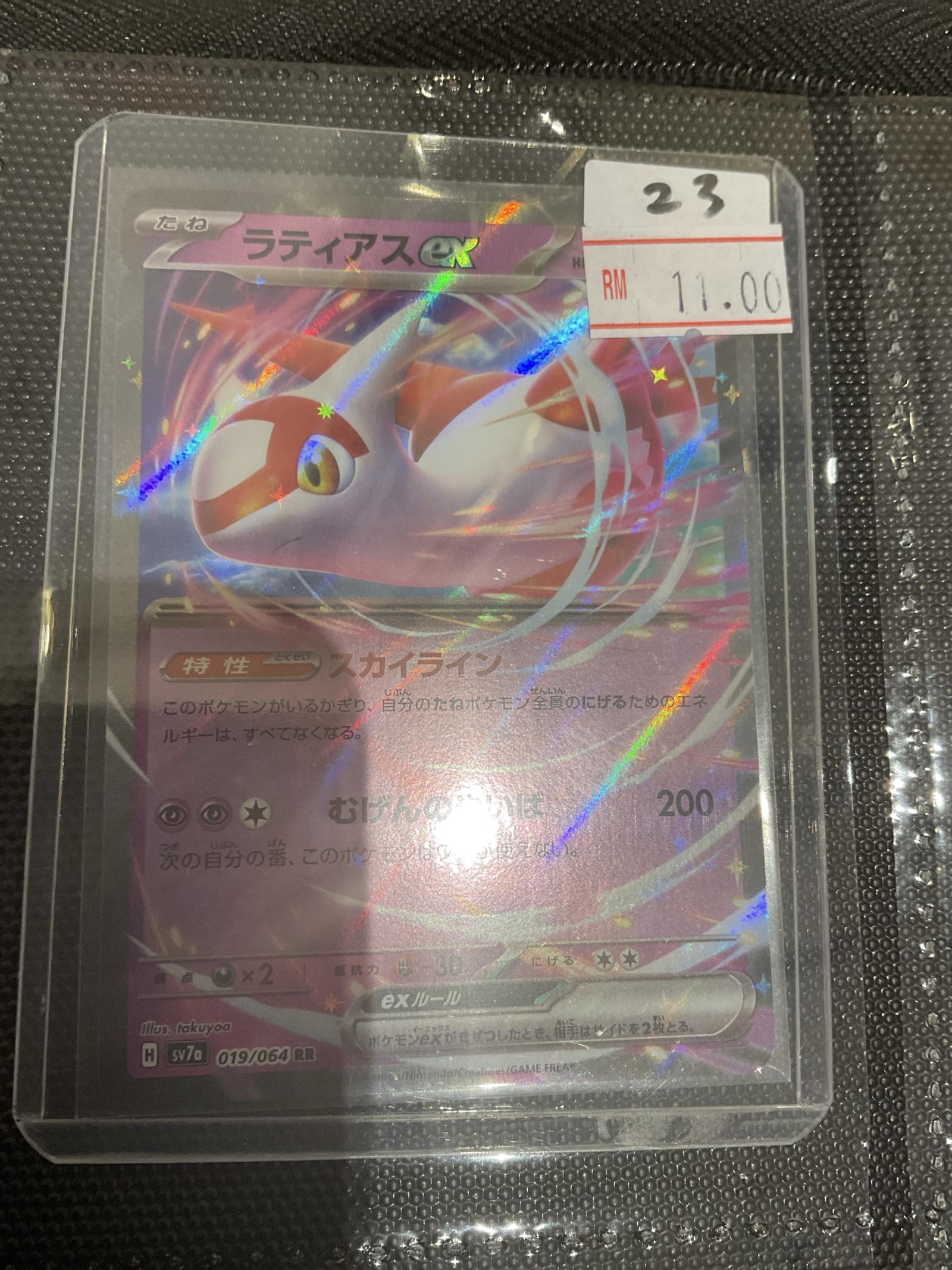 Japanese Pokemon TCG card Latias ex, card number 019/064 from set code sv7a. Illustrated by tokuyo. This card is a holo rare with rainbow foil pattern. Latias ex is a collectible card that also has potential use in some formats but mainly sought after for collection. Condition shown in the image. Price tag attached showing RM 11.00.