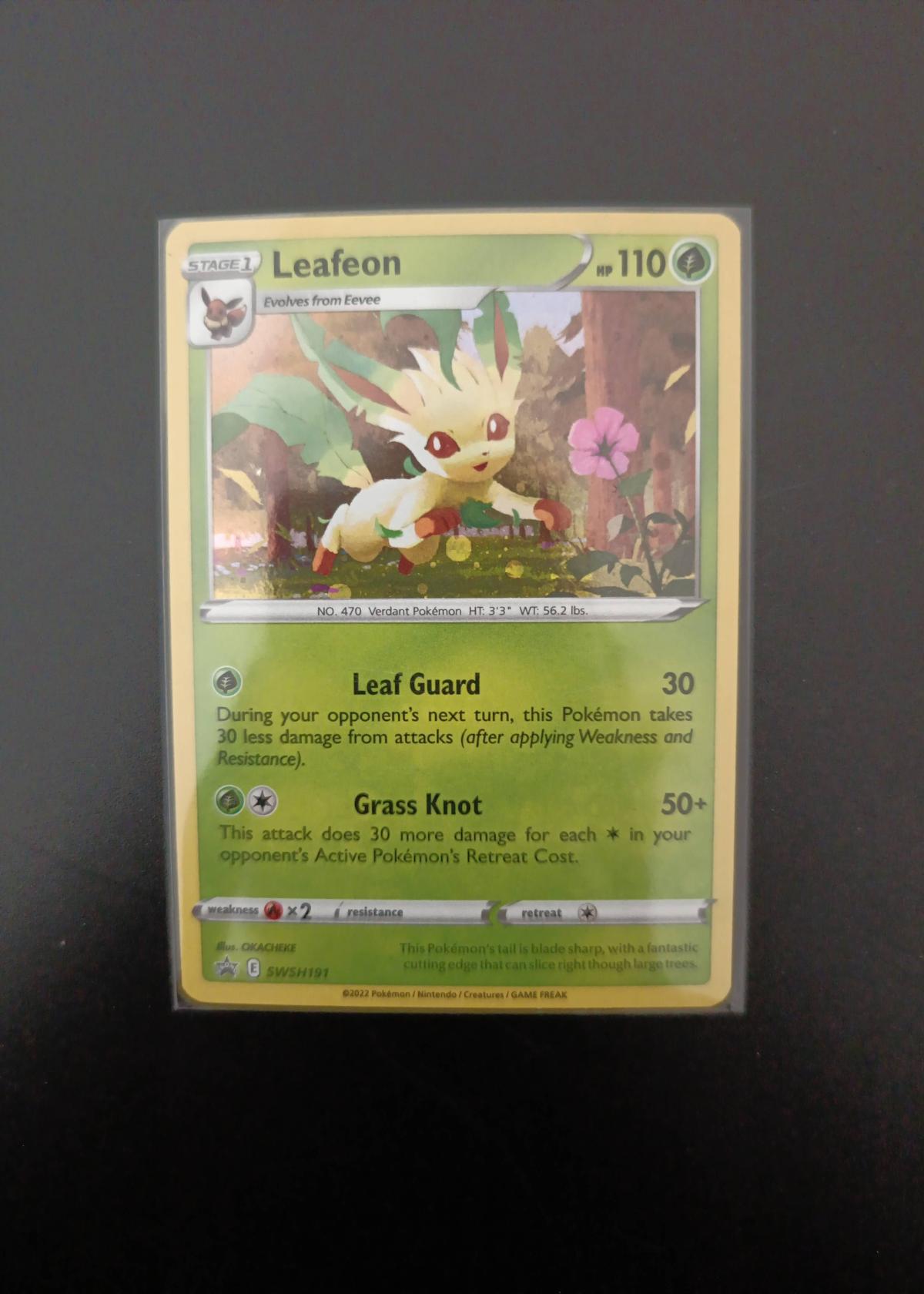 Leafeon (SWSH191) is a promo card illustrated by OKACHEKE from the Sword & Shield Black Star Promos. This card features Leaf Guard and Grass Knot attacks and carries the promo code SWSH191. It is not foil. As a promo, it's primarily collectible rather than highly competitive in current meta decks.