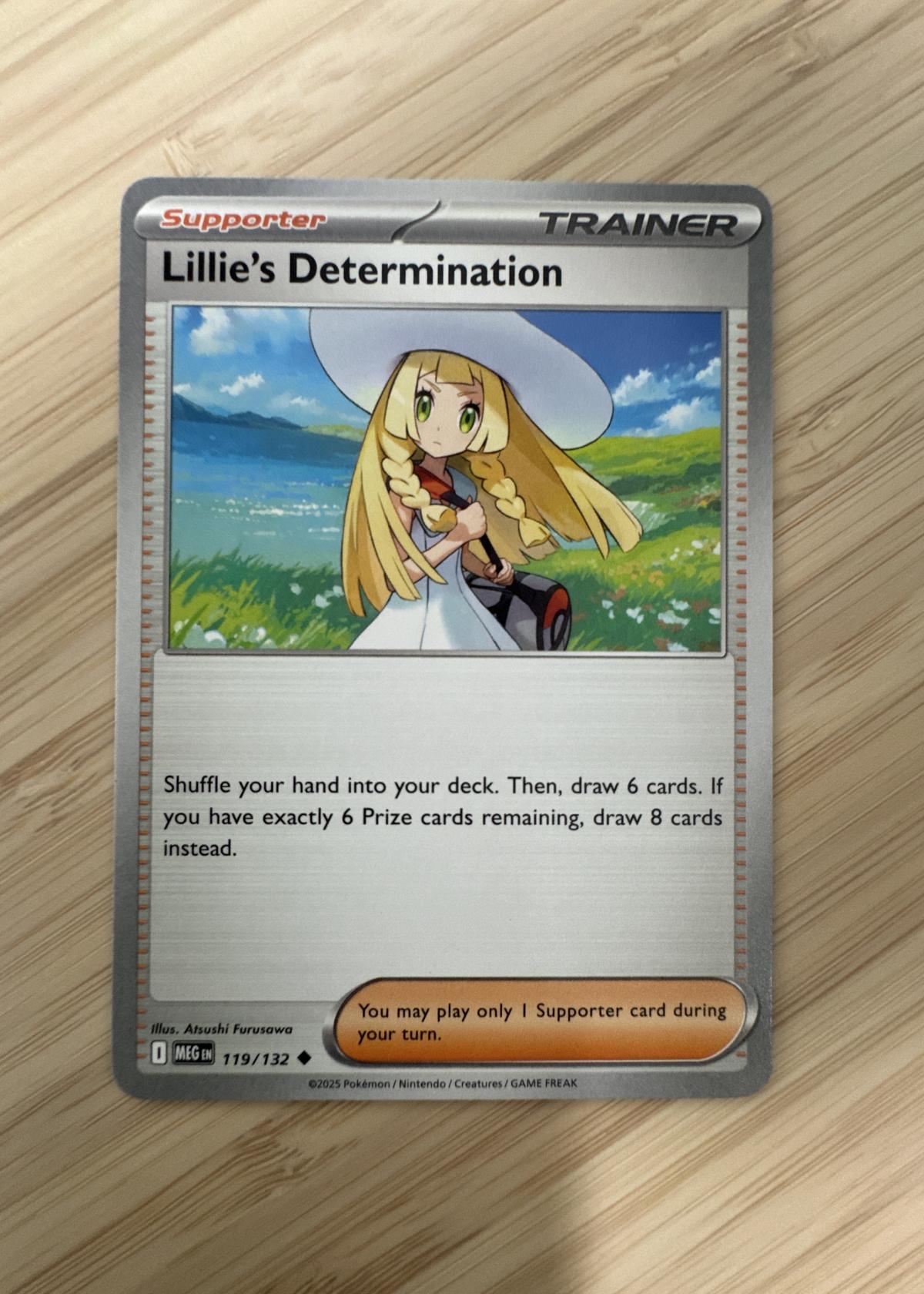 This listing is for a raw, ungraded copy of Lillie's Determination (119/132) from the 2025 Pokémon TCG set. The card is in good physical condition with vibrant artwork illustrated by Atsushi Furusawa. This edition is the standard non-foil version, perfect for players and collectors alike.