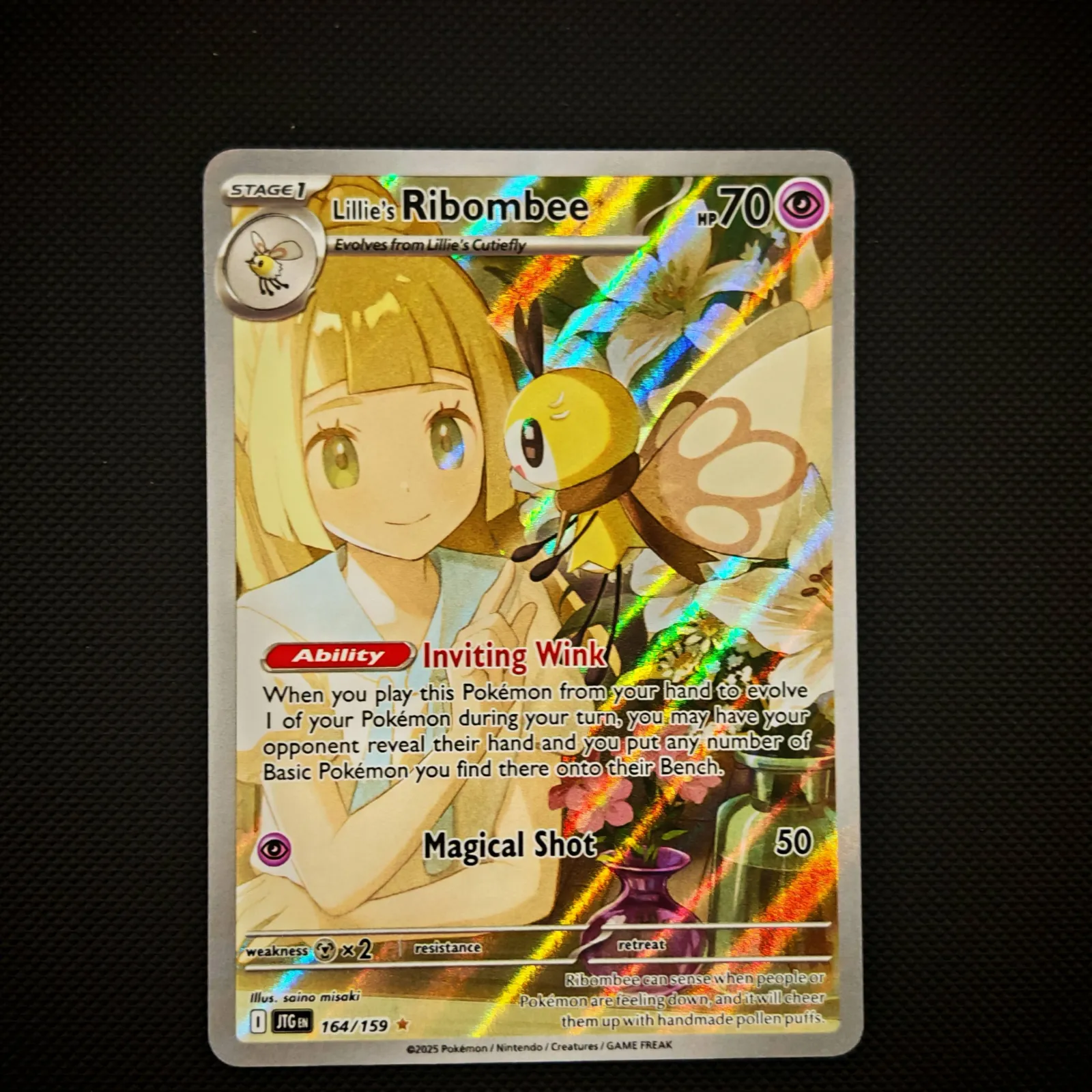 Product Details Card Number / Rarity:164/159 / Illustration Rare Card Type / HP / Stage:Psychic / 70 / Stage 1 Card Text: Ability — Inviting Wink