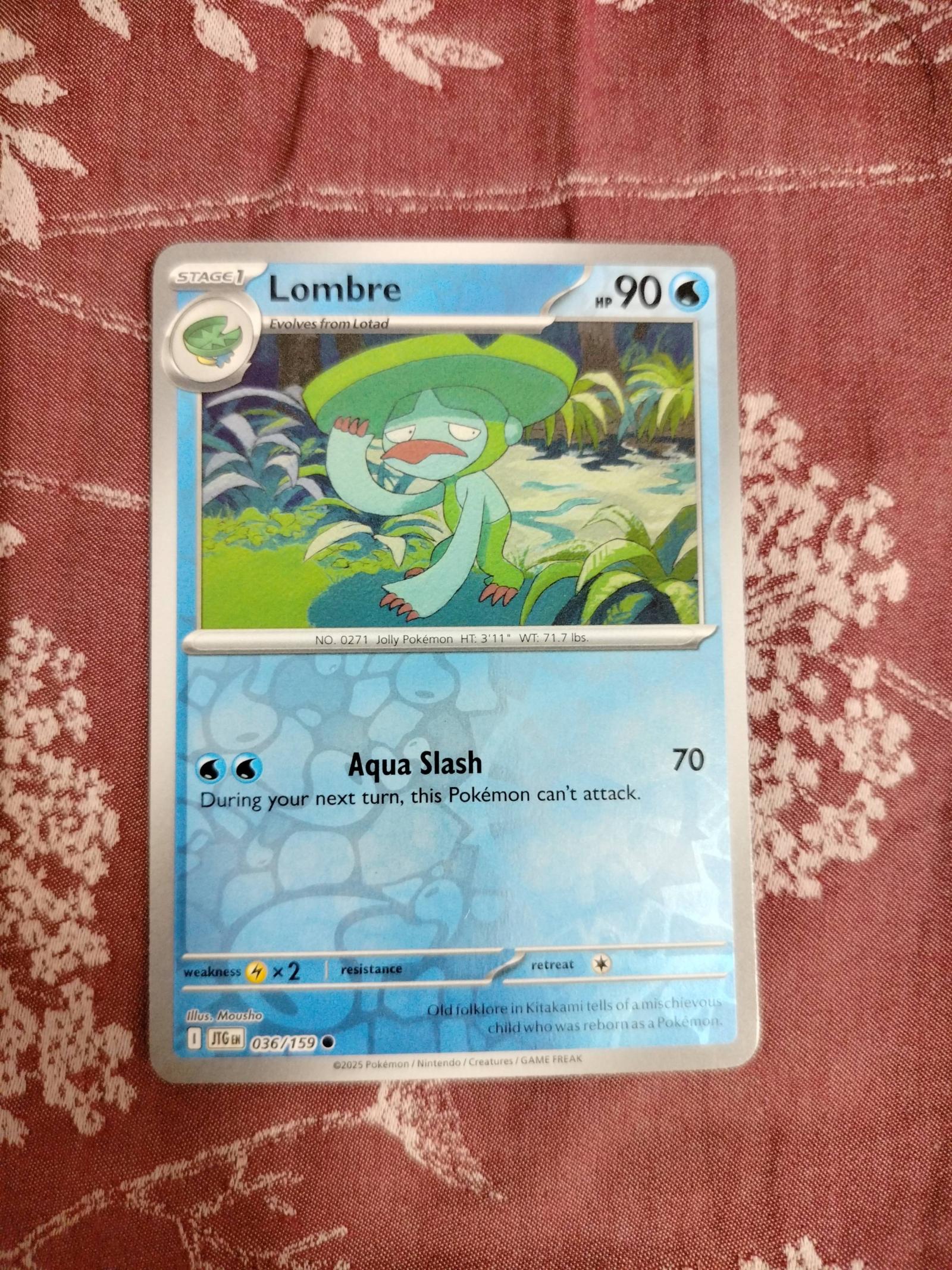 Lombre (Japanese) from the set JTG, card number 036/159, illustrated by Mousho. This water-type Stage 1 Pokémon card features the attack Aqua Slash with 70 damage. The card is non-foil and collectible, playable in the Pokémon TCG. The card includes the 6-digit code 036159 and is part of the 2023 Pokemon TCG release.