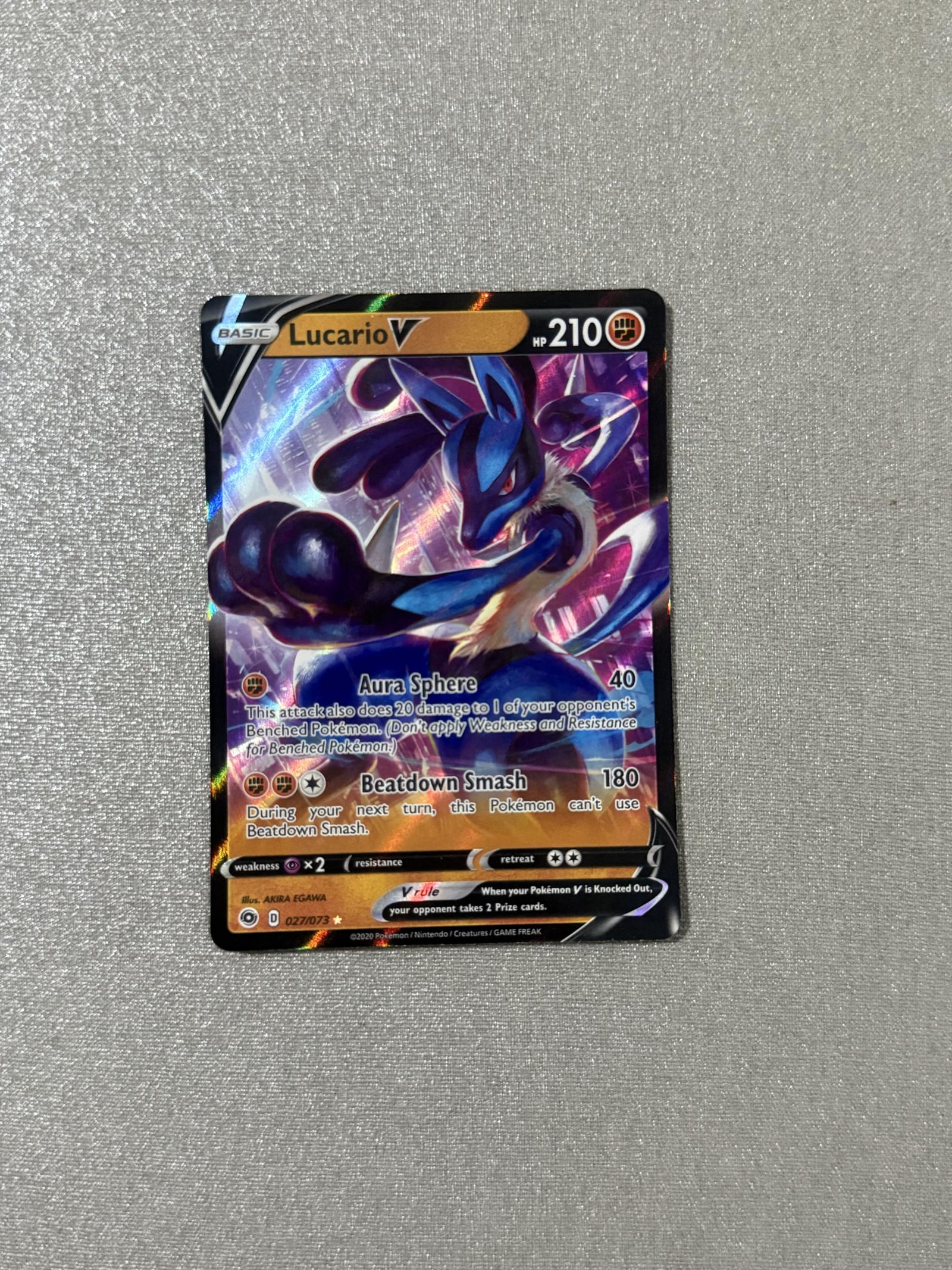Lucario V from the Sword & Shield set, card number 027/073. Illustrated by Akira Egawa. This holo foil card features strong attacks Aura Sphere and Beatdown Smash with 210 HP. Playable in the current meta and collectible for holographic artwork. Card code: 269210. English language.