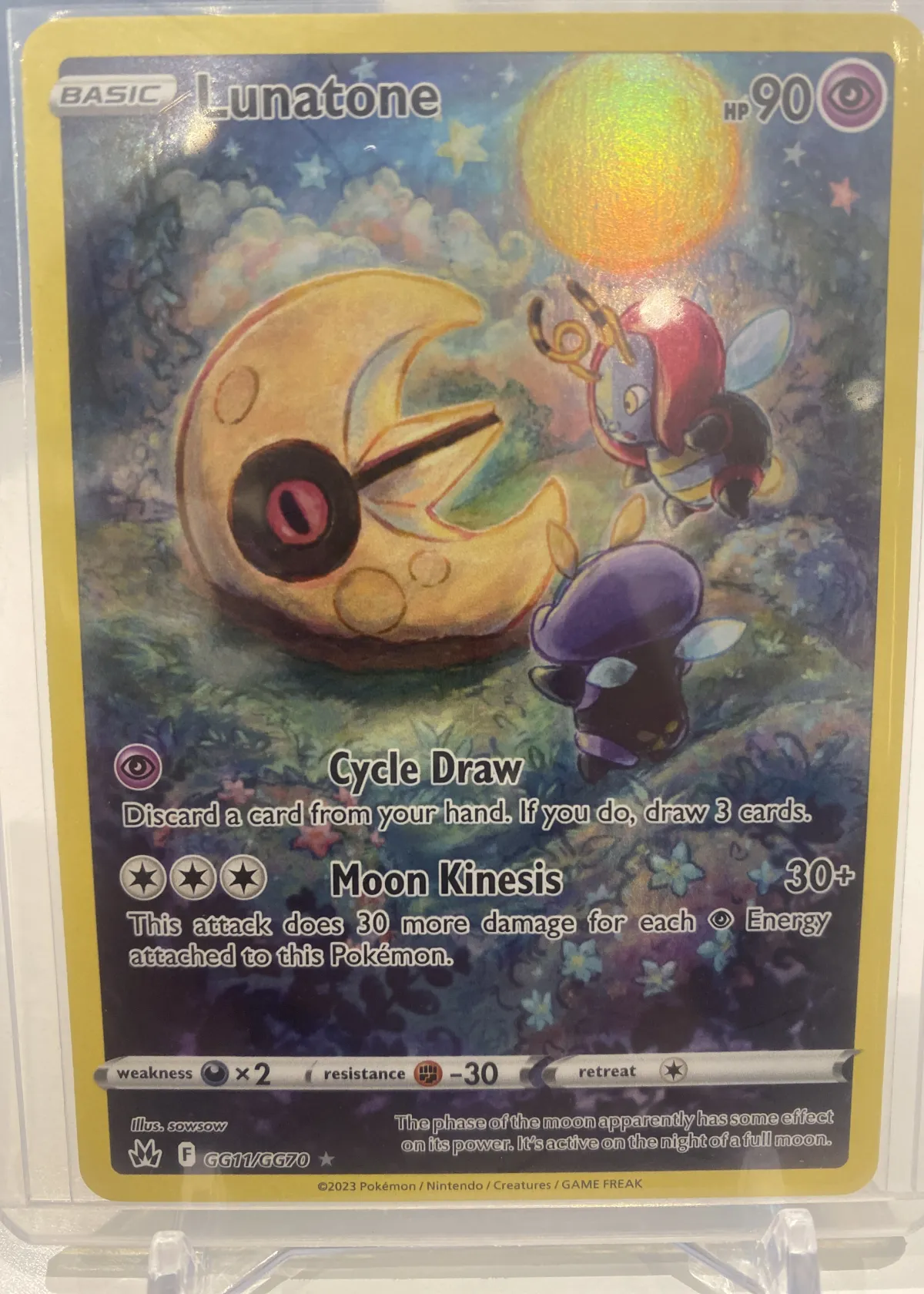 This is a holographic Lunatone card featuring artwork by artist Naoyo Kimura. It includes the moves 'Cycle Draw' and 'Moon Kinesis'.