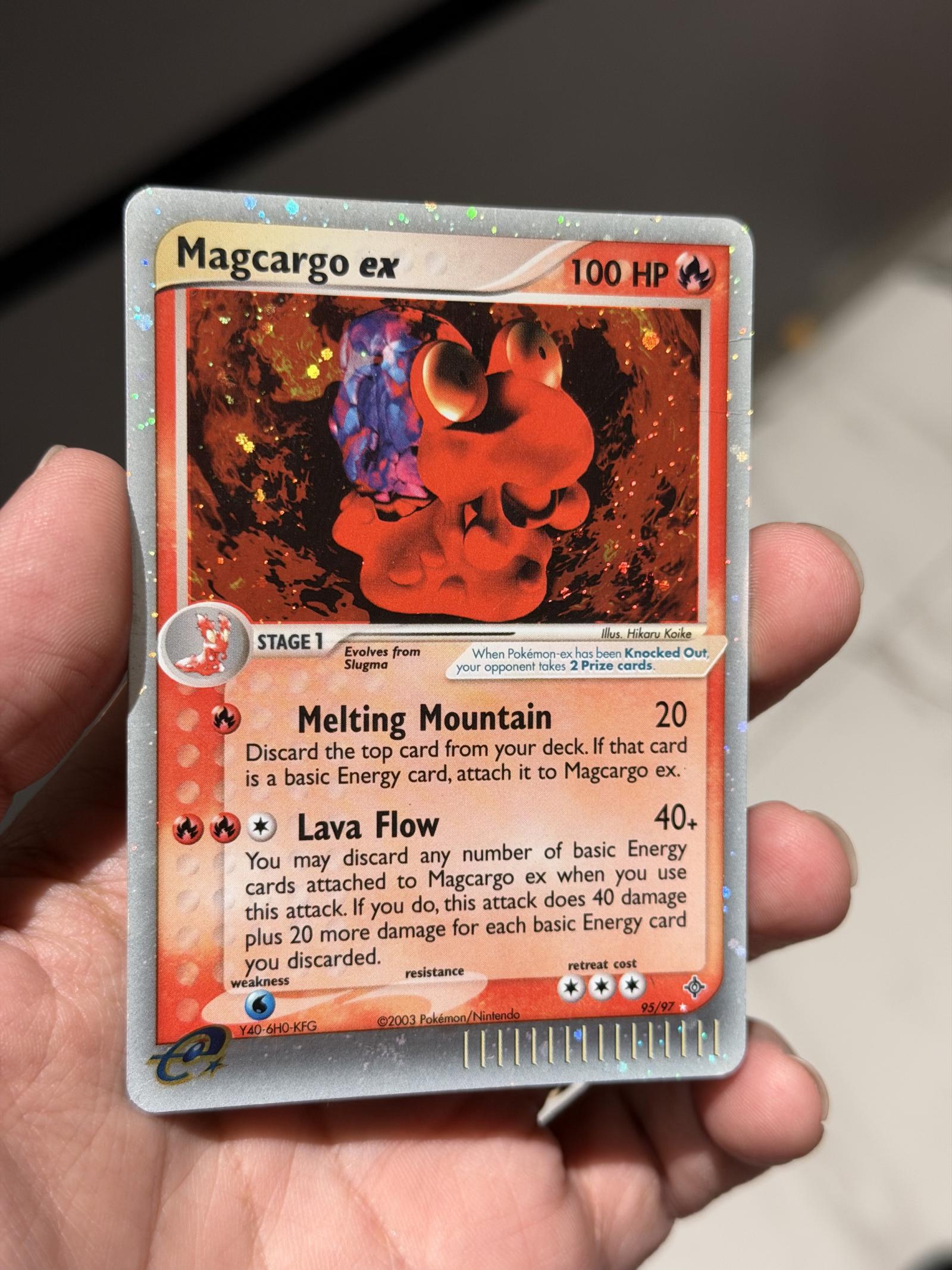 Magcargo ex card from the e-Card set, card number 95/97. Illustrated by Hikaru Koike and released in 2003 by Pokémon/Nintendo. This card features the Fire type with 100 HP and has a holo foil treatment. It is a Stage 1 card evolving from Slugma. The card is playable but mostly sought after by collectors due to its rarity and holographic finish.