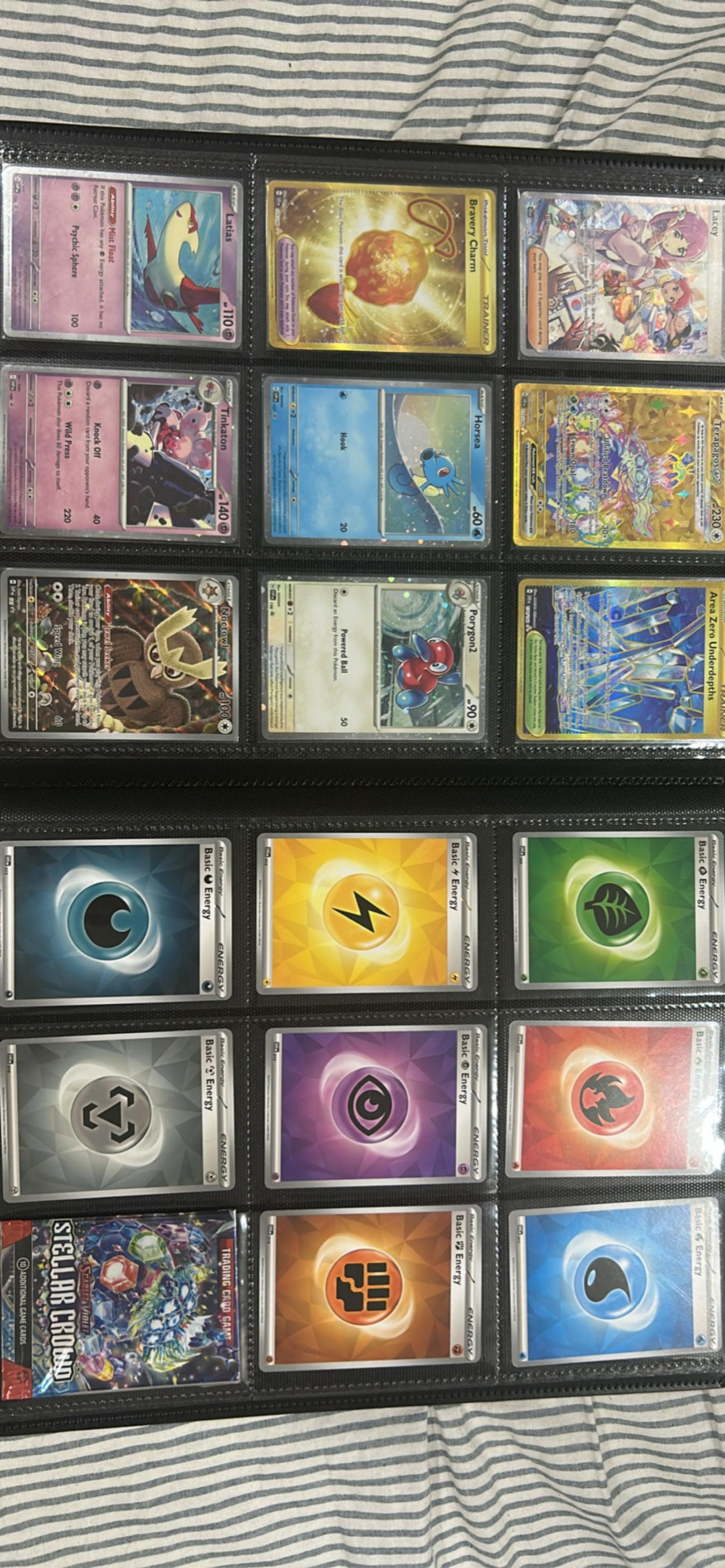 Contents & notable features: A mixed lot of Pokémon, Trainer, and Basic Energy cards. The collection includes multiple holo/foil and rainbow/shiny variants, several full-art Trainer and Supporter cards, a handful of high-rarity holo Pokémon (including playable card types such as V/EX-style and large artwork Full Arts), and a set of basic energy cards in modern artwork. Also includes at least one sealed or unplayed Stellar Crown pack visible in the binder pockets.