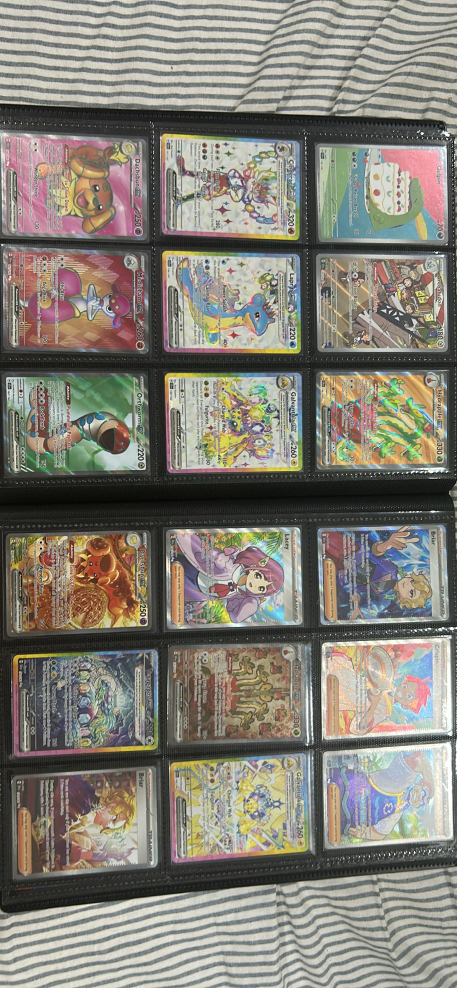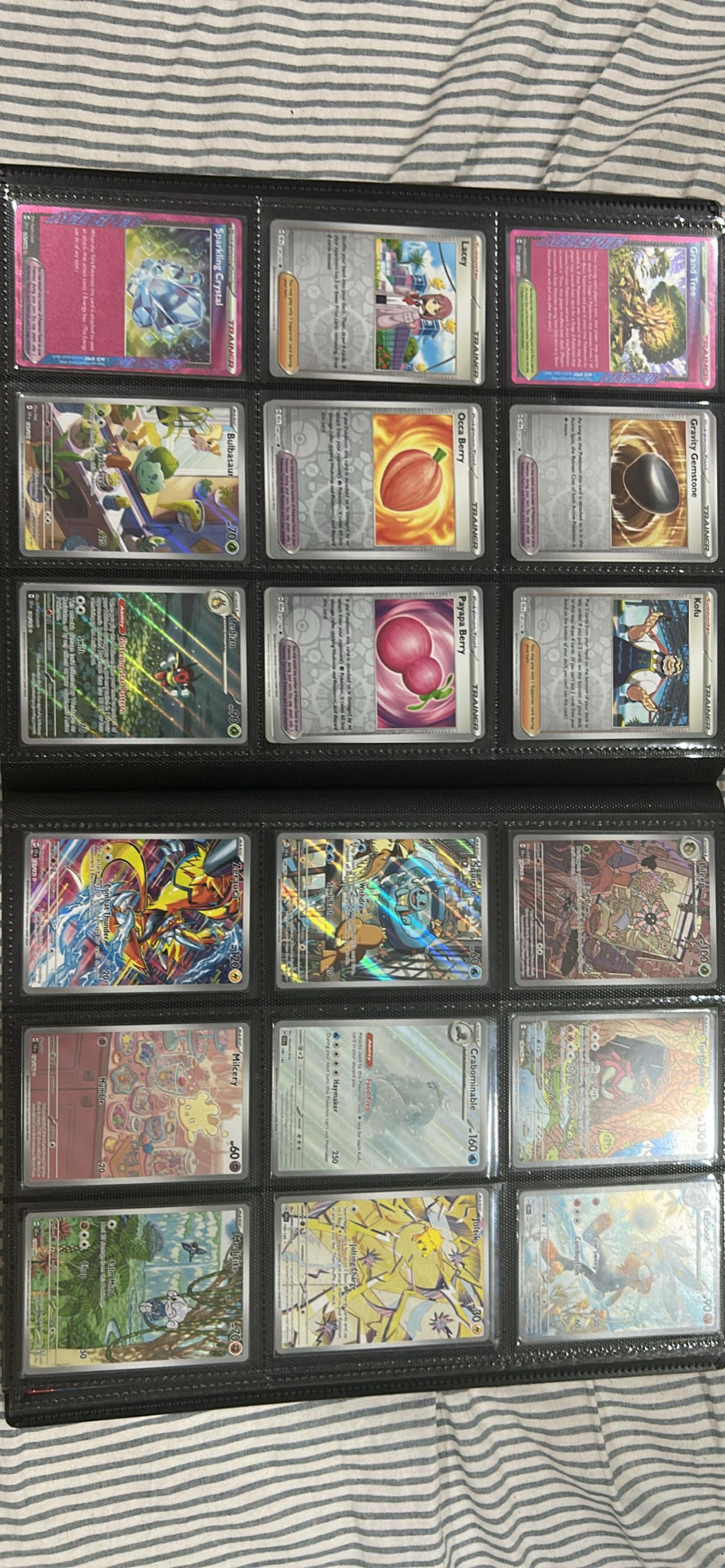 Additional observations: Cards are organized in a binder with clear sleeves; photos show a mixture of near-mint to lightly played surfaces. Exact rarities, card numbers, and artist names appear on each card and can be provided on request for specific listings. This lot is a good starter set for someone building a holo/shiny collection or seeking trade fodder and playable Trainer/support pieces.