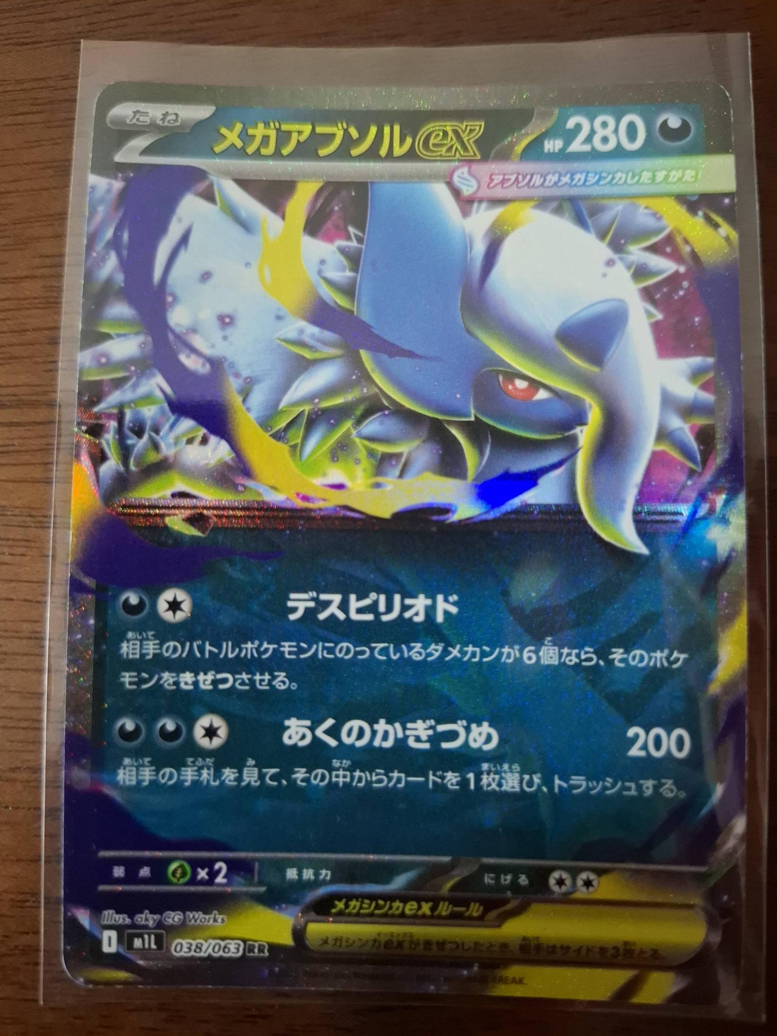 Mega Absol ex card number 038/063 from the Japanese Pokemon set. Illustrated by CG Works. This is a rare reverse holo foil card. The card is playable in the Pokemon TCG meta and is a highly sought collectible.