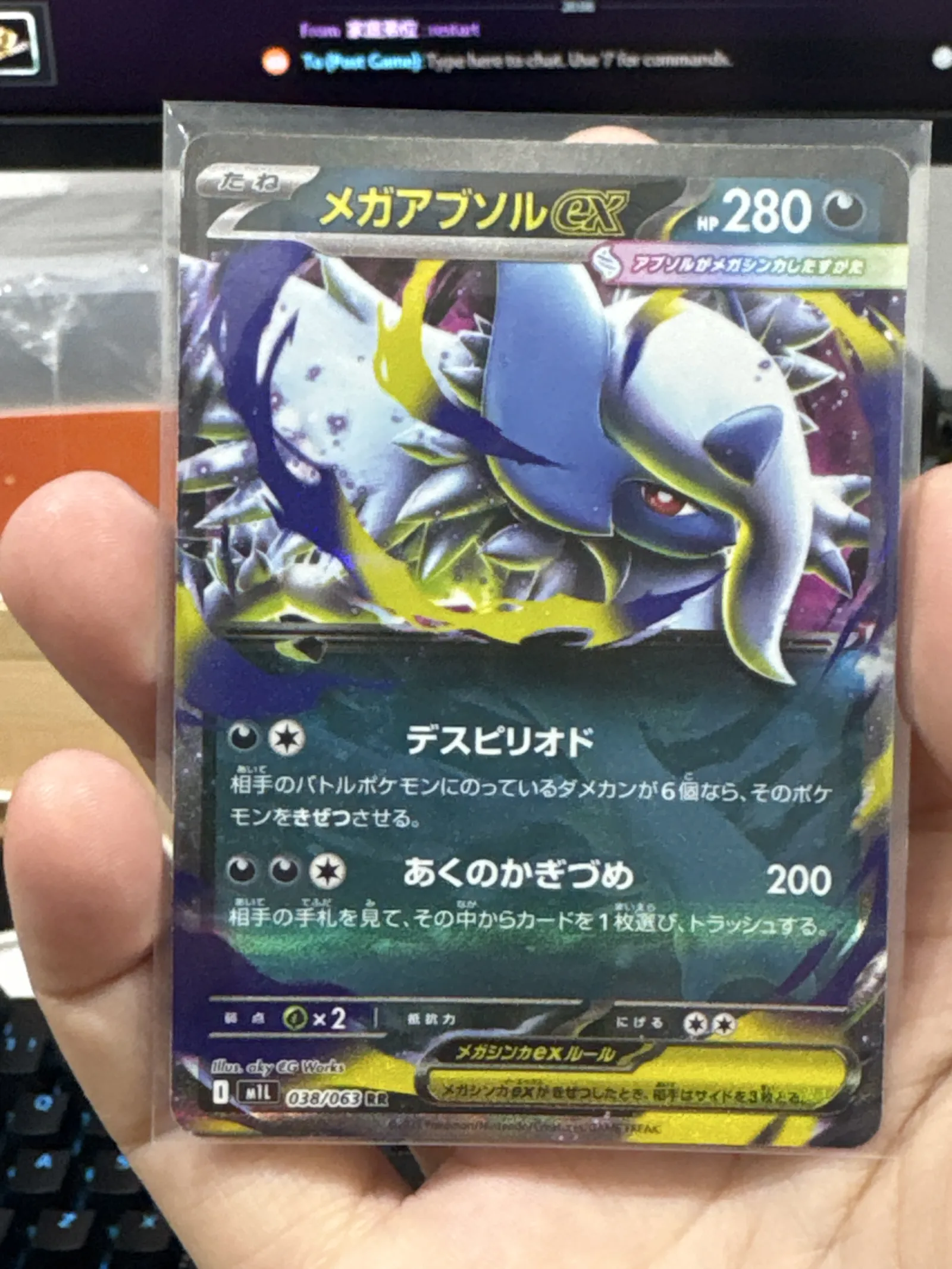 Rare Japanese Pokémon trading card featuring Mega Absol EX with 280 HP. The card has a holographic foil design and is in a protective sleeve. Text and moves are in Japanese, showcasing powerful attacks and abilities.