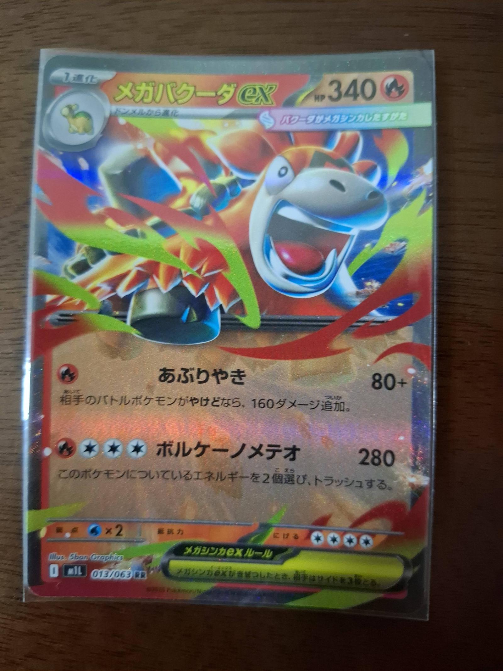 Mega Camerupt EX from the Japanese set with card code 013/063 RR illustrated by 5ban Graphics. This holo rare card features dynamic artwork and is a collectible for fans. Card is playable in meta with powerful attacks. Text is in Japanese.