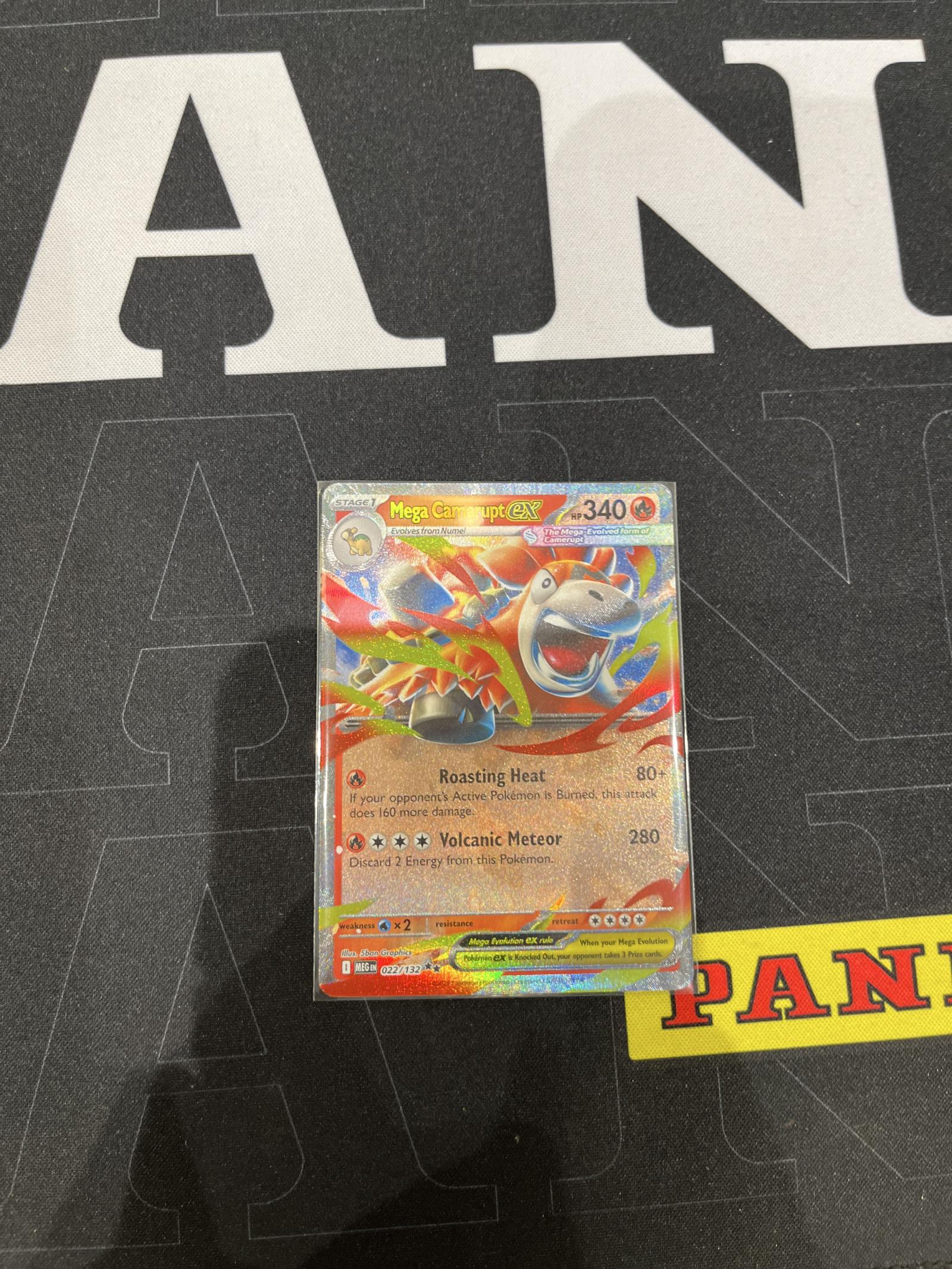 This listing features a raw, ungraded Mega Camerupt EX Full Art Holo Rare from the XY set, card number 022/132. Showcasing impressive artwork by 5ban Graphics, the card boasts a vibrant full-art holographic finish that makes it a standout in any collection. With a substantial 340 HP and powerful attacks—Roasting Heat (which can deal up to 240 damage if your opponent's Pokémon is Burned) and Volcanic Meteor (a massive 280 damage)—this card is both eye-catching and formidable in battle settings.