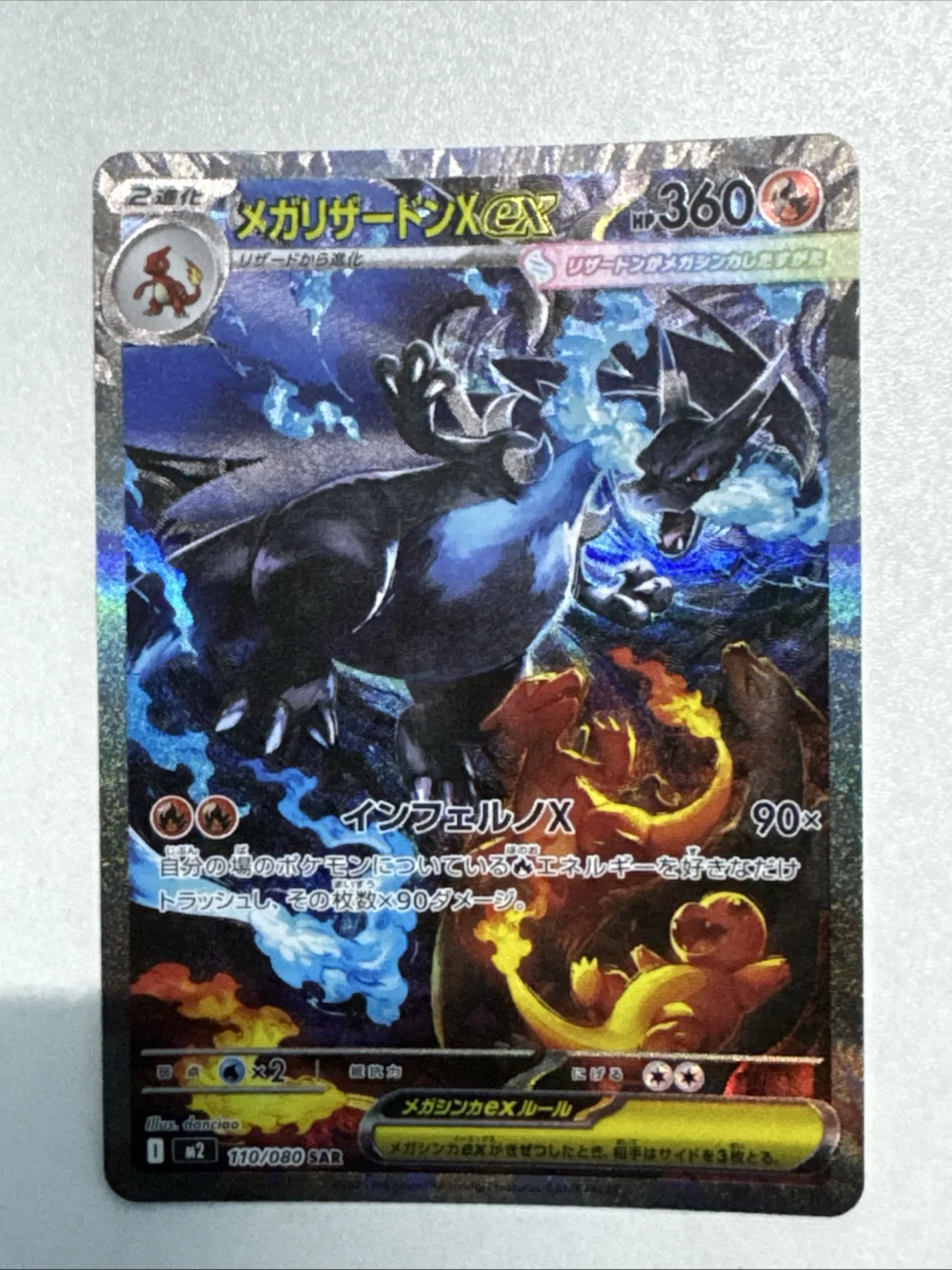 Japanese Mega Charizard X EX card from the Pokemon Trading Card Game. Collector number 110/080, set code M2, card code 110080, illustrated by daniio. This card features a secret rare (SAR) printing treatment with a full-art foil design. Playable in the meta and highly collectible.