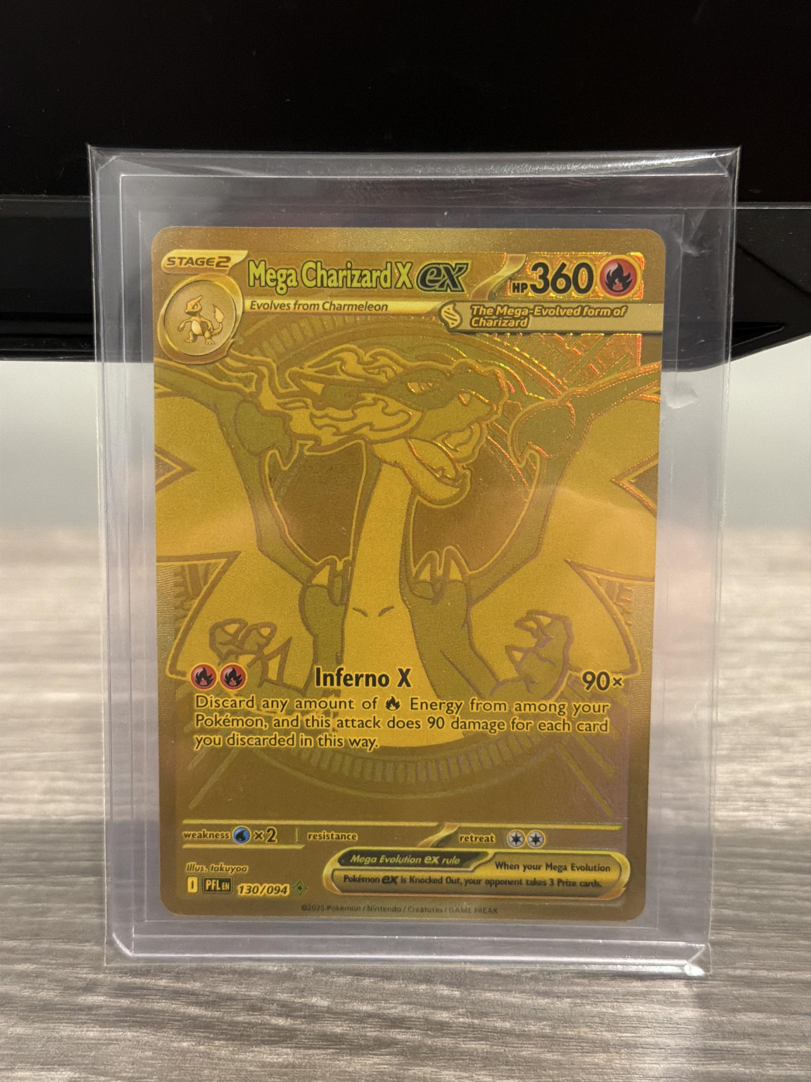 Mega Charizard X EX card from the PFL set, card number 130/094. Illustrated by takuyoo, this gold secret rare features the Mega-Evolved form of Charizard. The card is foil and highly collectible, suitable for both play and collection.