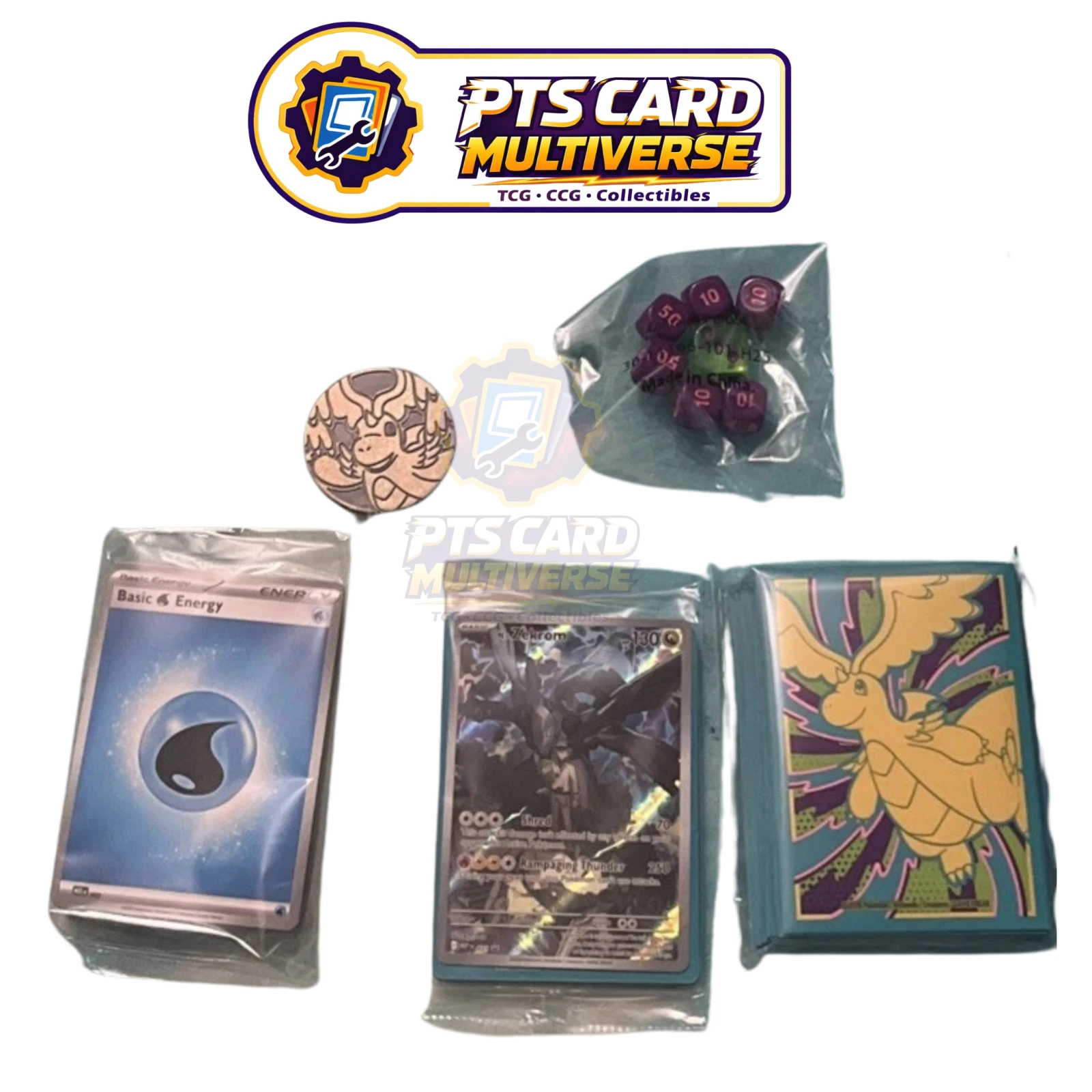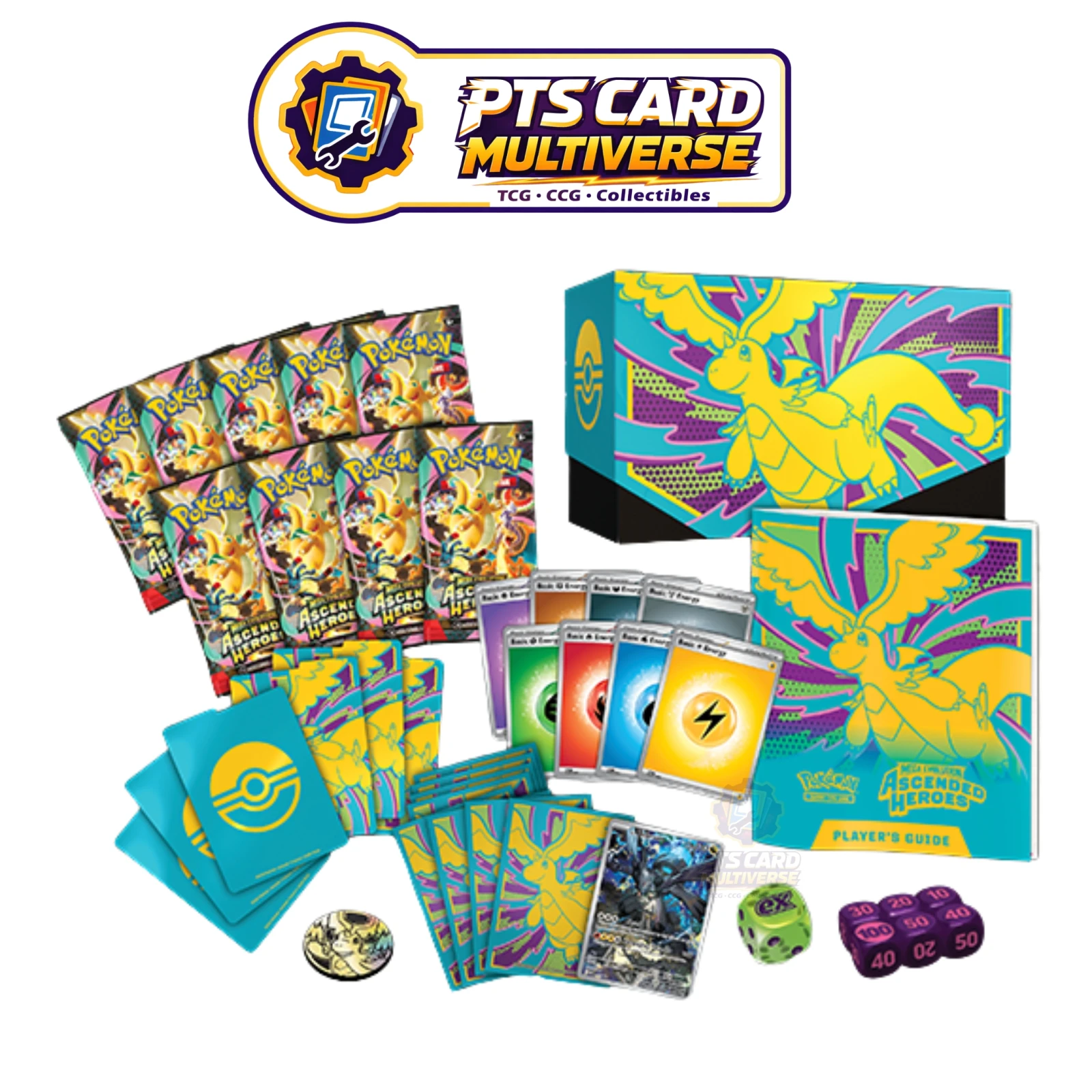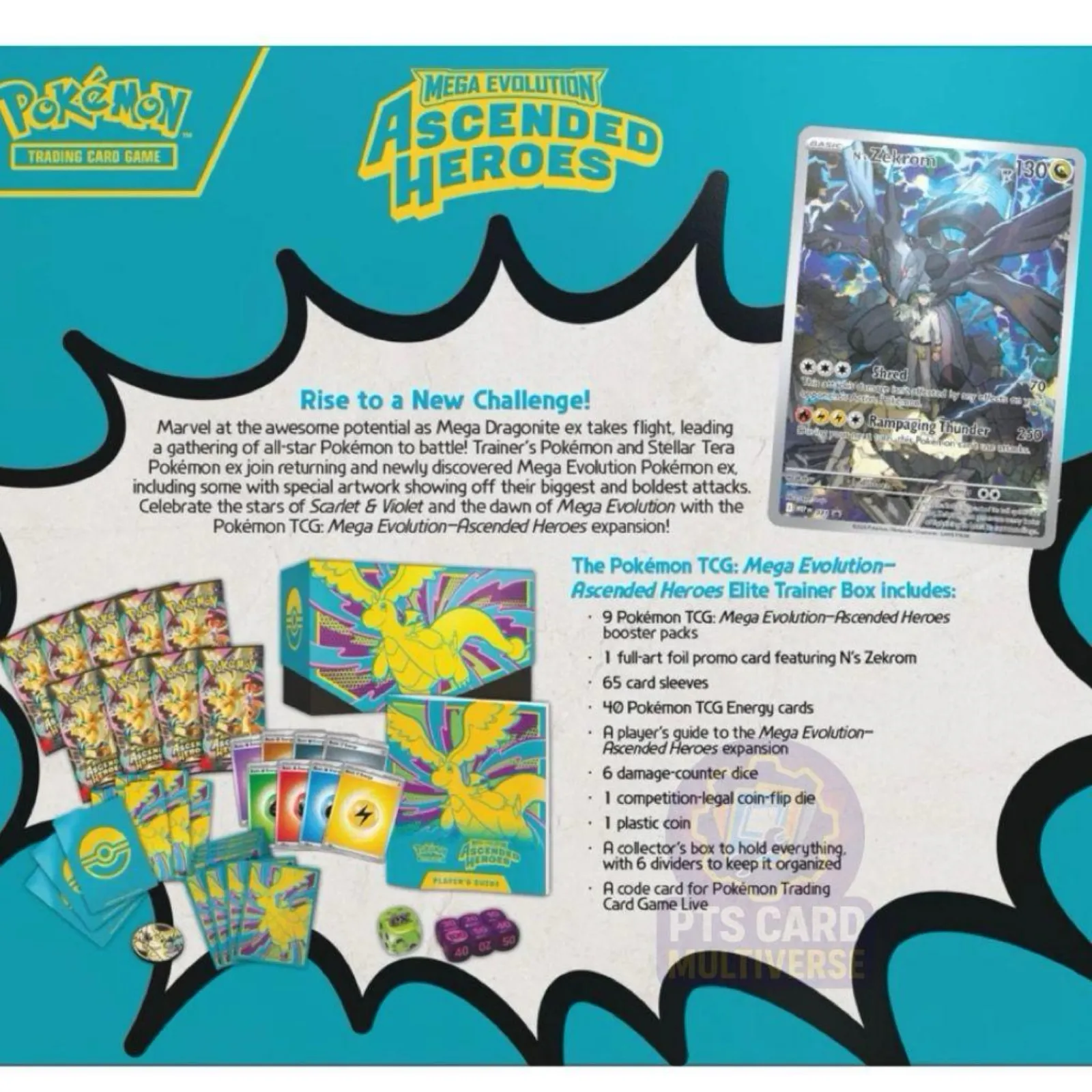 Contents & notable features: This is the Pokémon TCG: Mega Evolution—Ascended Heroes Elite Trainer Box (ME 2.5 ETB). Includes 9 Ascended Heroes booster packs (10 cards each + 1 Basic Energy), 1 full-art foil promo card featuring N’s Zekrom, 65 card sleeves, 40 Energy cards, a player’s guide for the set, 6 damage-counter dice, 1 competition-legal coin-flip die, 1 plastic coin, 6 box dividers, and a Pokémon TCG Live code card. All contents are factory-sealed.