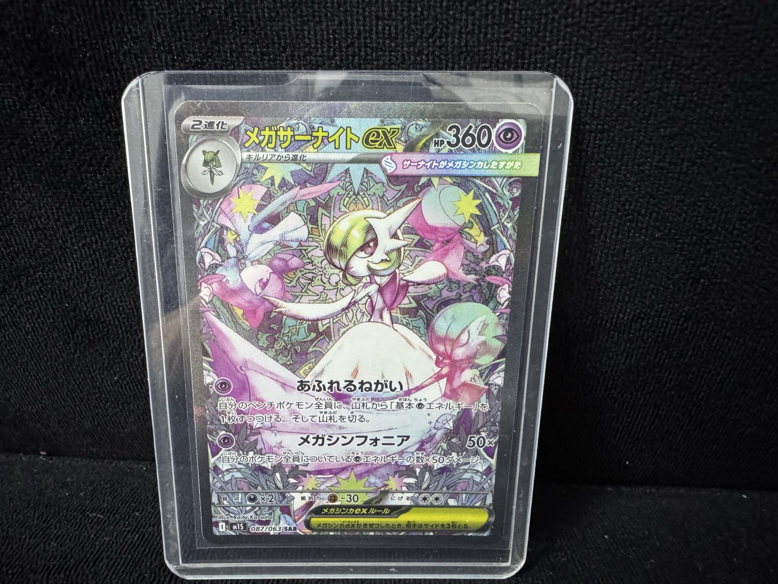 Mega Gardevoir EX Special Art Rare from the m1s set, card number 087/063, Japanese language. This is a full art, foil card featuring detailed artwork. The 6-digit card code is 087063. The card is collectible and also playable in the Pokémon TCG meta. The card is in excellent condition and securely protected in a plastic sleeve.