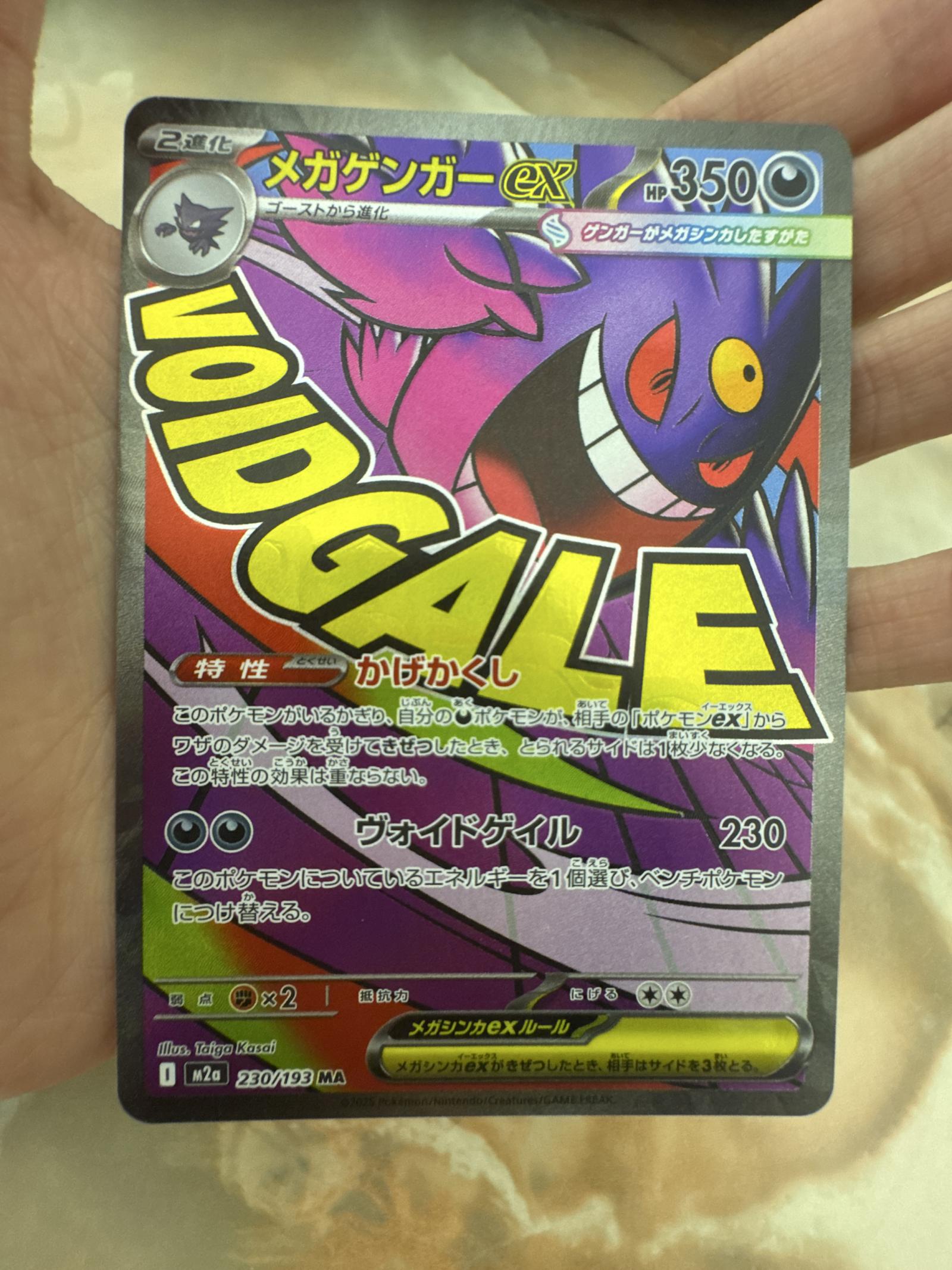 Mega Gengar EX card from the M2a set, numbered 230/193. Illustrated by Taiga Kasai. Japanese language. This card features Mega Evolution with a high HP of 350 and the powerful Void Gale attack. It is a foil Ultra Rare card. The card is playable in the Pokemon TCG meta and is highly collectible due to its rarity and unique art.
