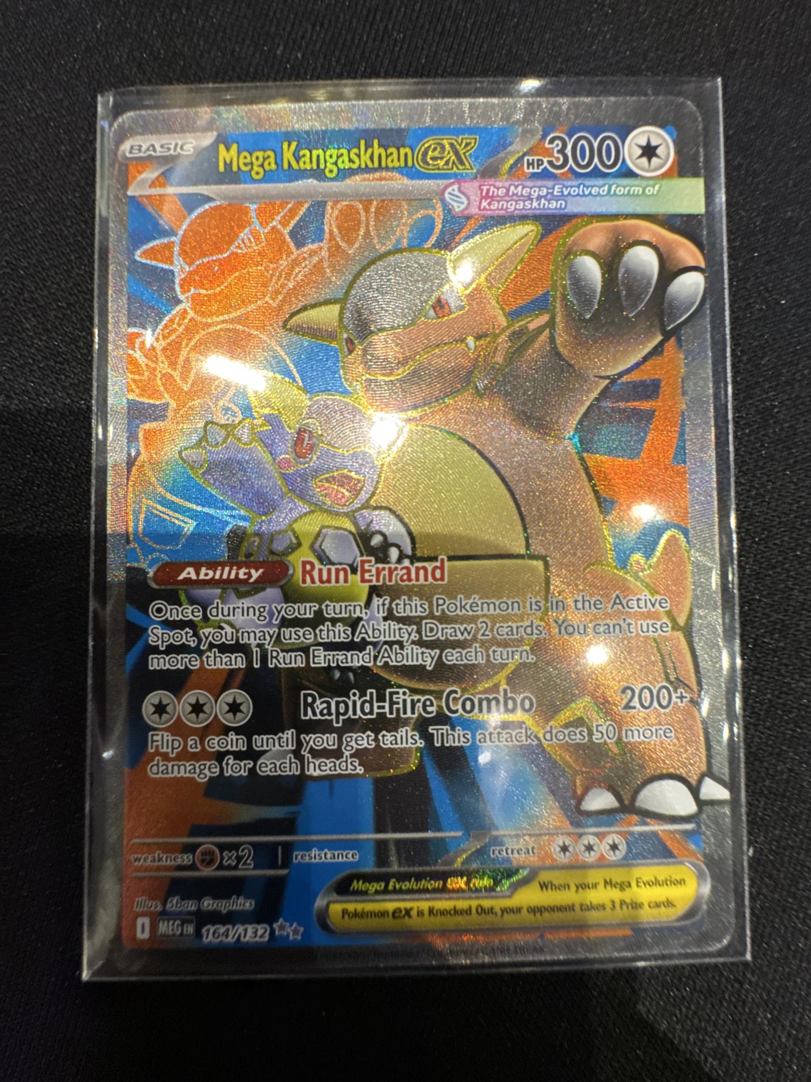 Mega Kangaskhan EX 164/132, illustrated by 5ban Graphics, from the MEG (Mega Evolution) set. This is a full art card with a holographic foil treatment. The card features the ability 'Run Errand' and attack 'Rapid-Fire Combo'. It is playable in the Pokémon TCG meta and prized for its collector value. Language code: EN (English).
