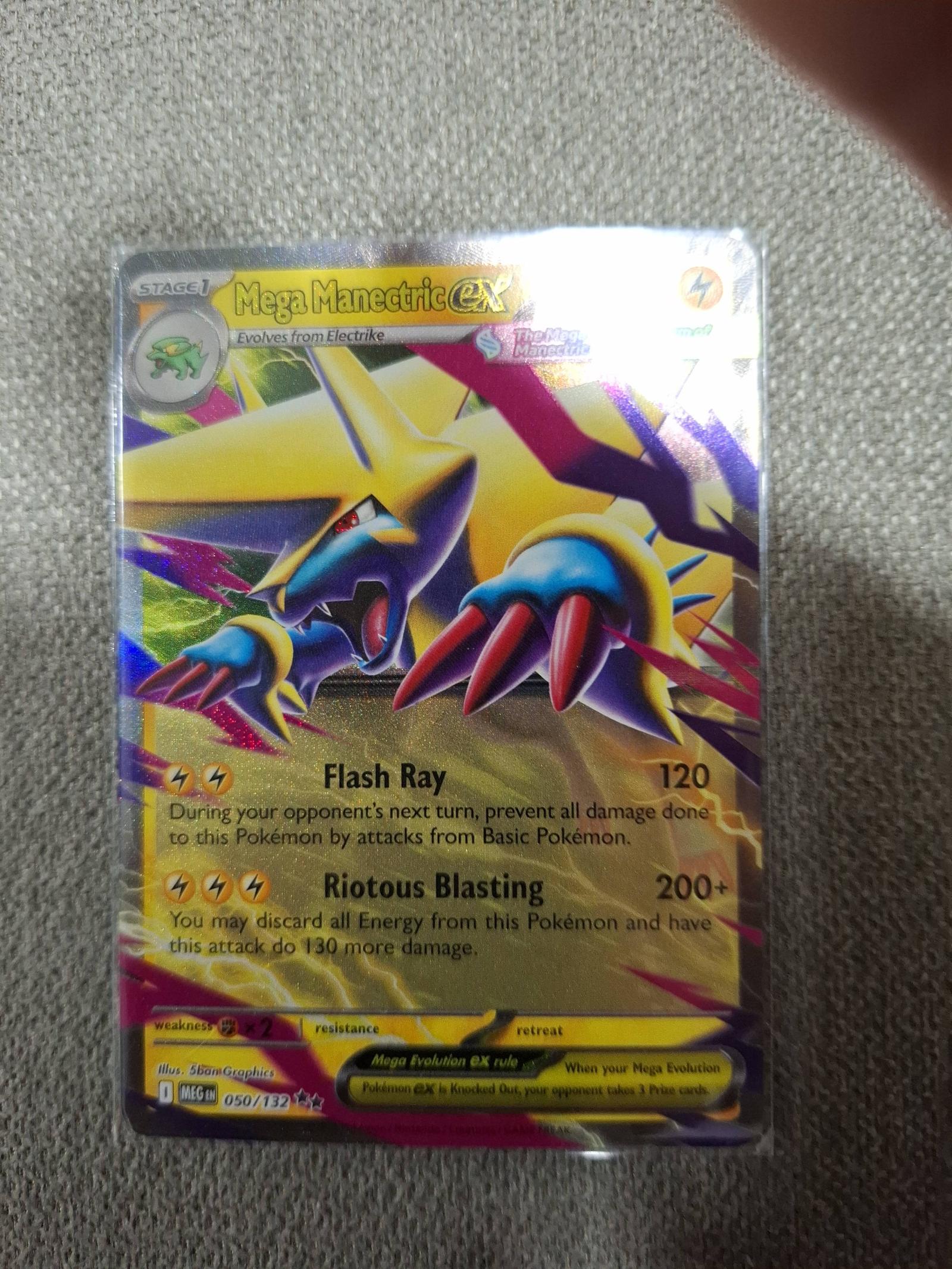 Mega Manectric ex holographic card from the Plasma Blast set (050/132). Illustrated by 5ban Graphics. This card features powerful attacks Flash Ray and Riotous Blasting, making it playable in competitive formats. The card is foil and features the Mega Evolution ex rule.