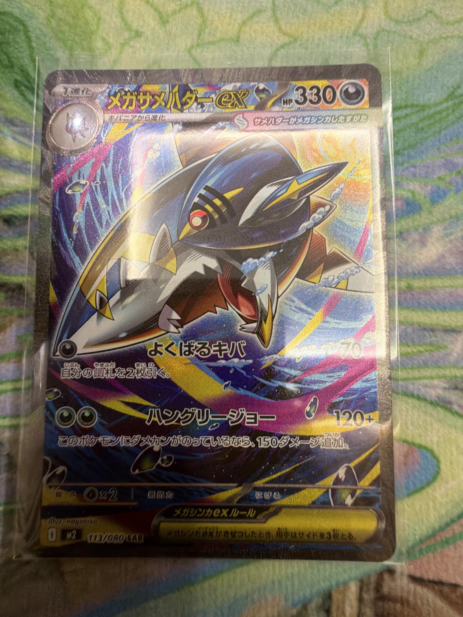 Mega Sharpedo ex (メガサメハダーex) card number 113/080 from the Japanese EX series, artist nogimine. This holo foil card features 330 HP and is part of the EX set. The card is in Japanese and is collectible due to its shiny holo art and high HP. Suitable for collectors and fans of the EX meta series.