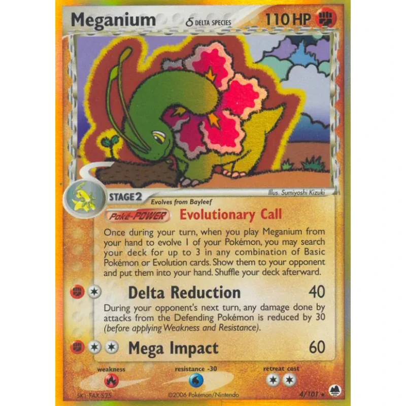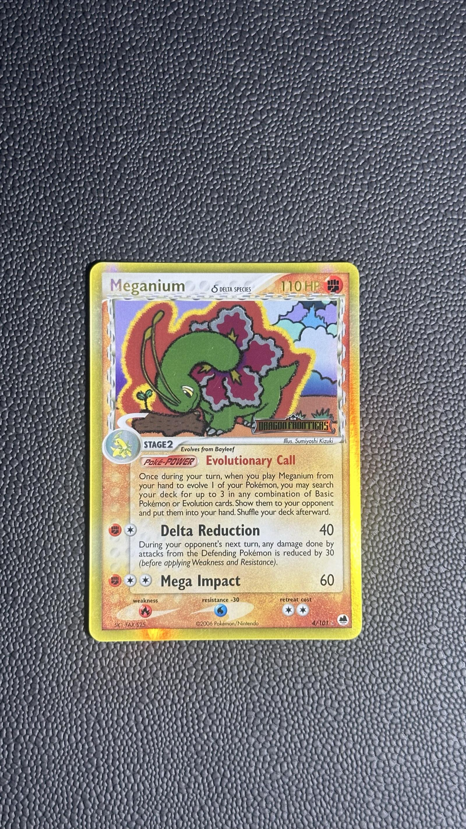 Meganium card from the EX Dragon Frontiers set, card number 4/101. Illustration by Sumiyoshi Kizuki. This is a reverse foil card with a Delta Species symbol. The card features the Evolutionary Call Poké-POWER and is playable in the Pokemon TCG meta. Card language is English.