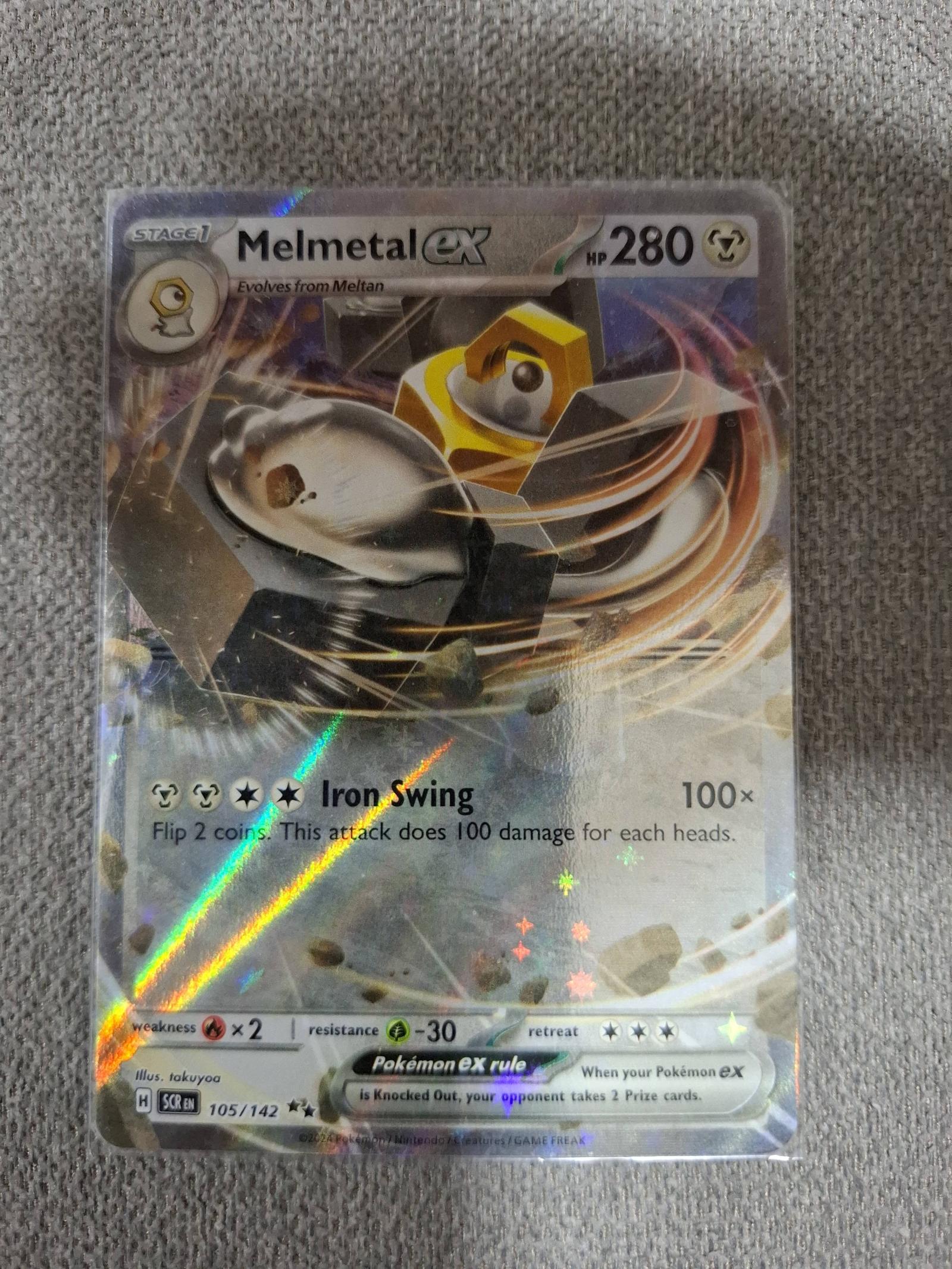 Melmetal ex from the Pokemon TCG set 105/142. Illustrated by takuyoa. This card is a secret rare holofoil card featuring the powerful Iron Swing attack. Playing a Metal-type with 280 HP, it is a collectible with competitive potential for certain deck builds.