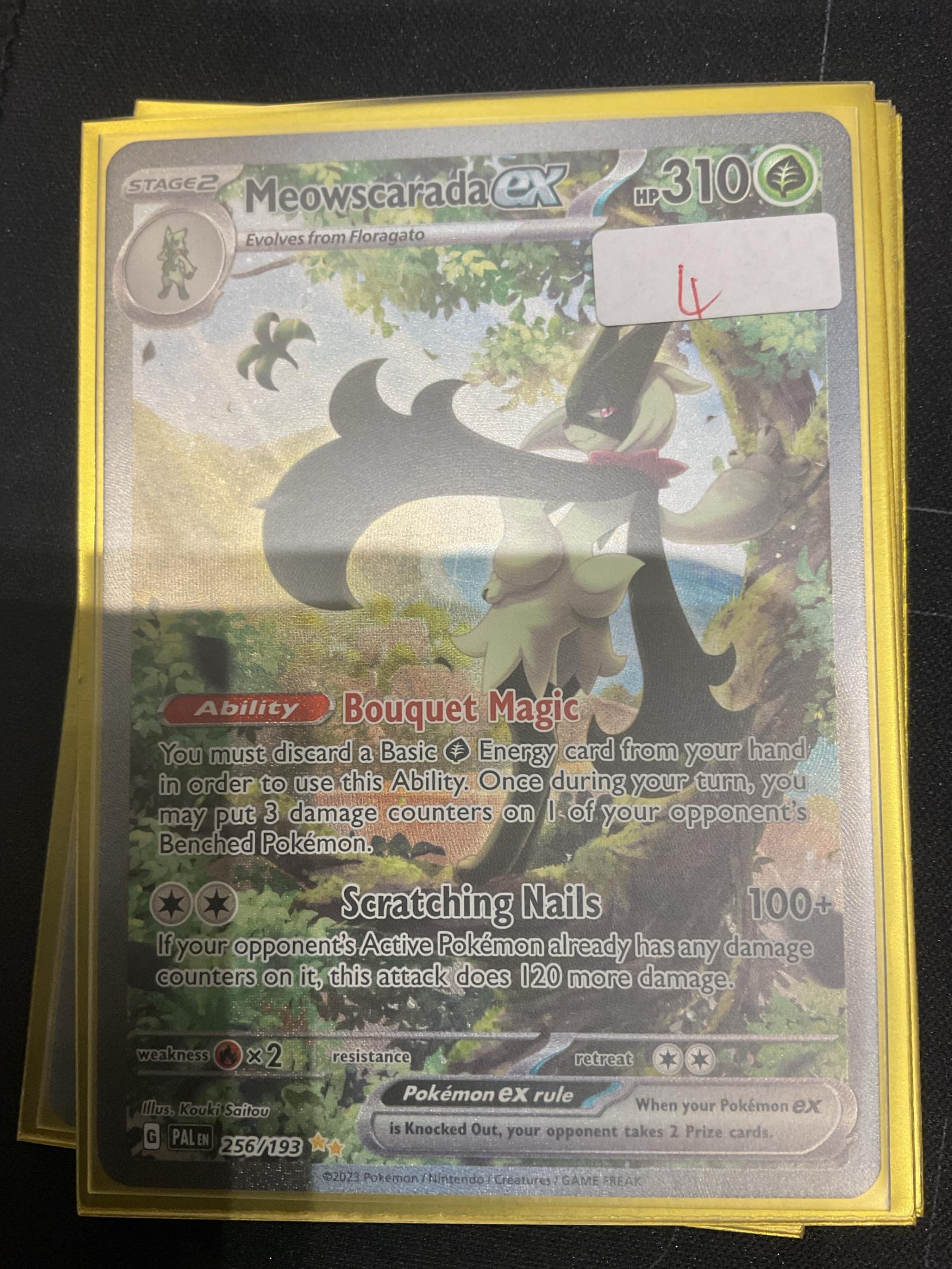 Meowscarada ex full art card from Pokémon TCG set Paldea League (PAL), card number 256/193. Illustrated by Kouki Saitou. This foil card features the ability Bouquet Magic and attack Scratching Nails. Playable in competitive meta as a strong Stage 2 Pokémon ex.