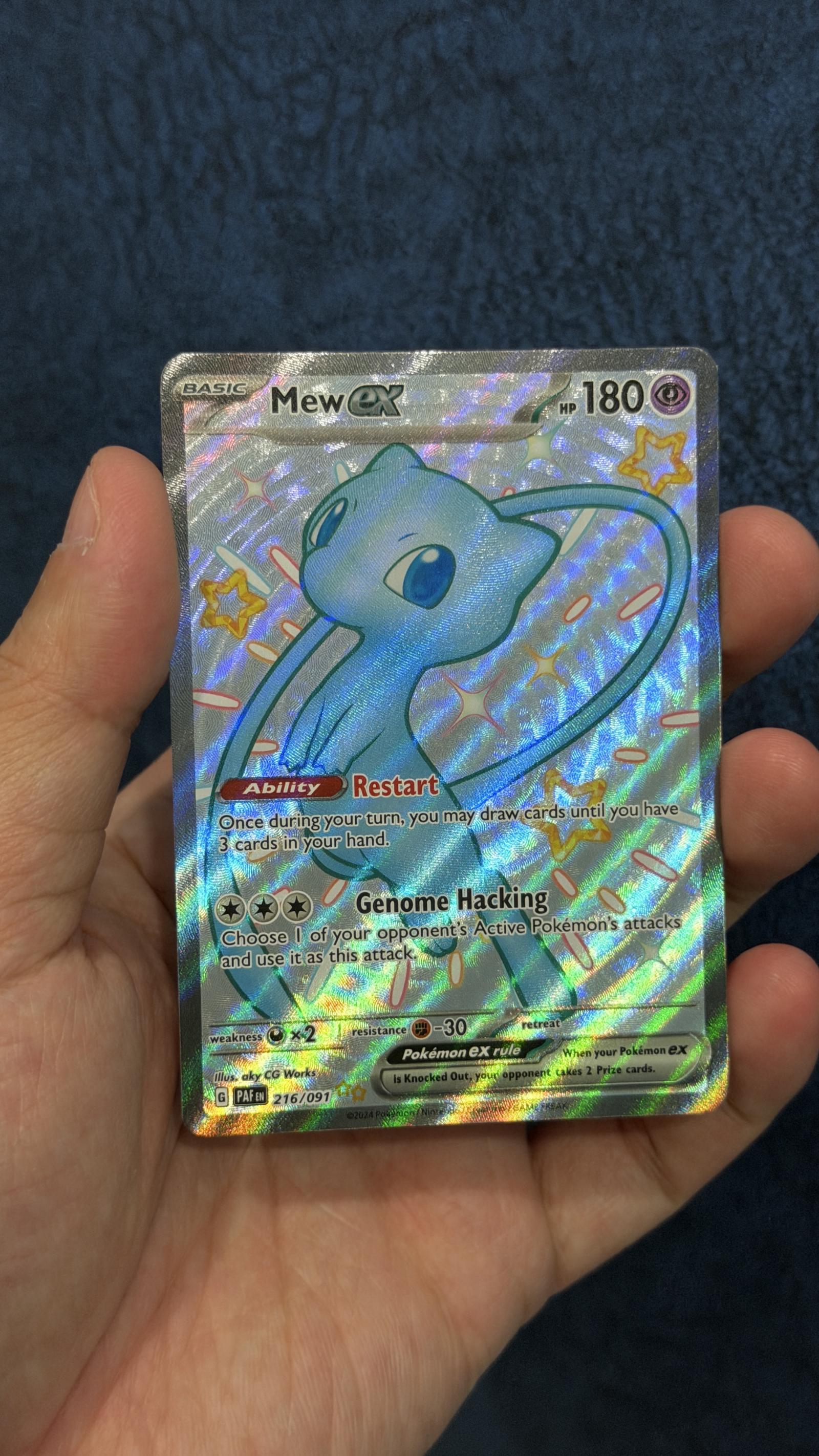 Mew ex from the Pokemon TCG, card number 216/091, set code PAF, artist CG Works. This is a holo foil card featuring the Restart ability and Genome Hacking attack. Playable in the meta with special EX rules. Card code: 216/091. Printed in English.