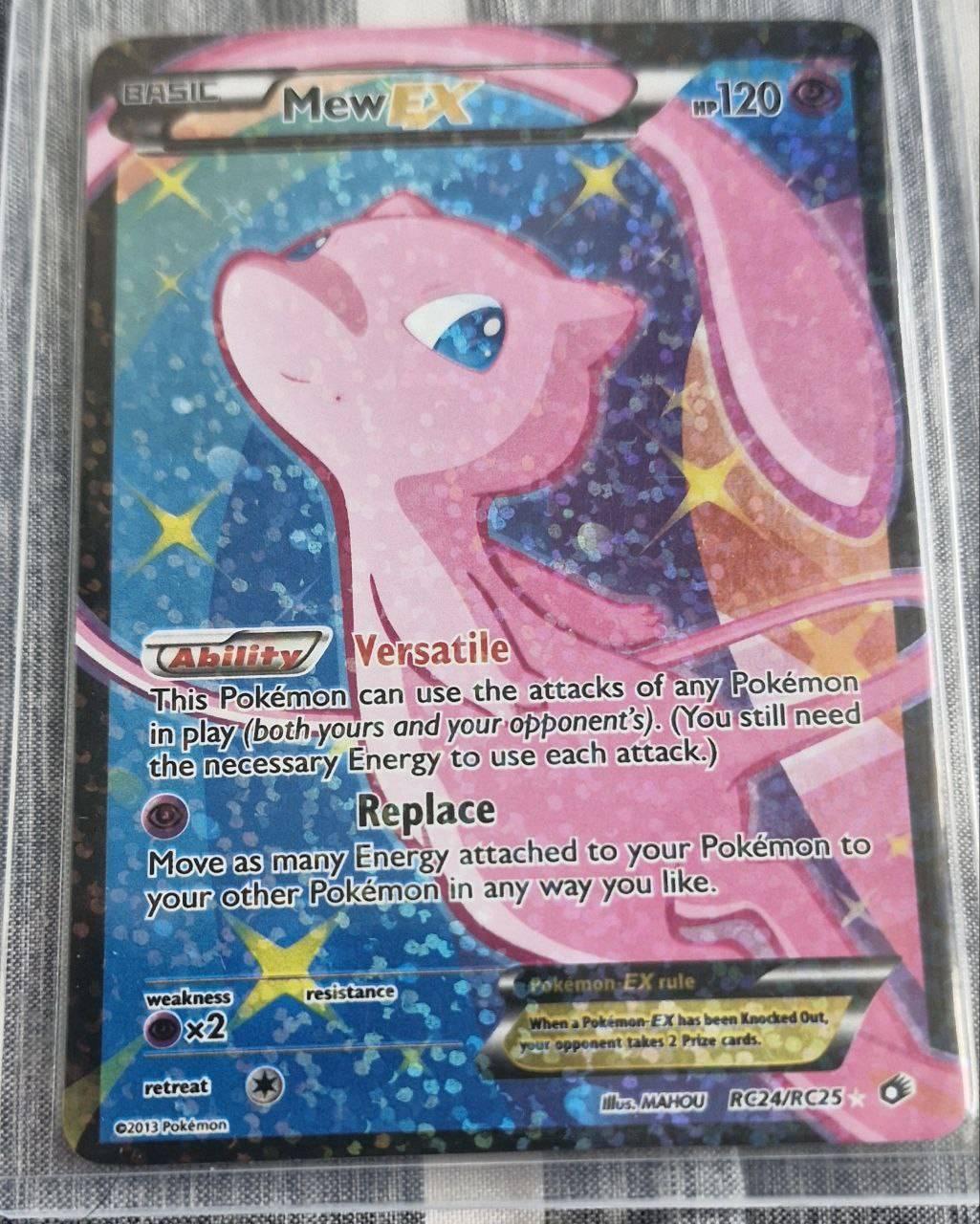 Mew EX RC24/RC25 from the HeartGold & SoulSilver set (2013) illustrated by MAHOU. This is a full art holo card with a foil finish. The card features Versatile ability allowing it to use attacks of any Pokémon in play. Playable in competitive meta as an EX card. Card number RC24 out of RC25.