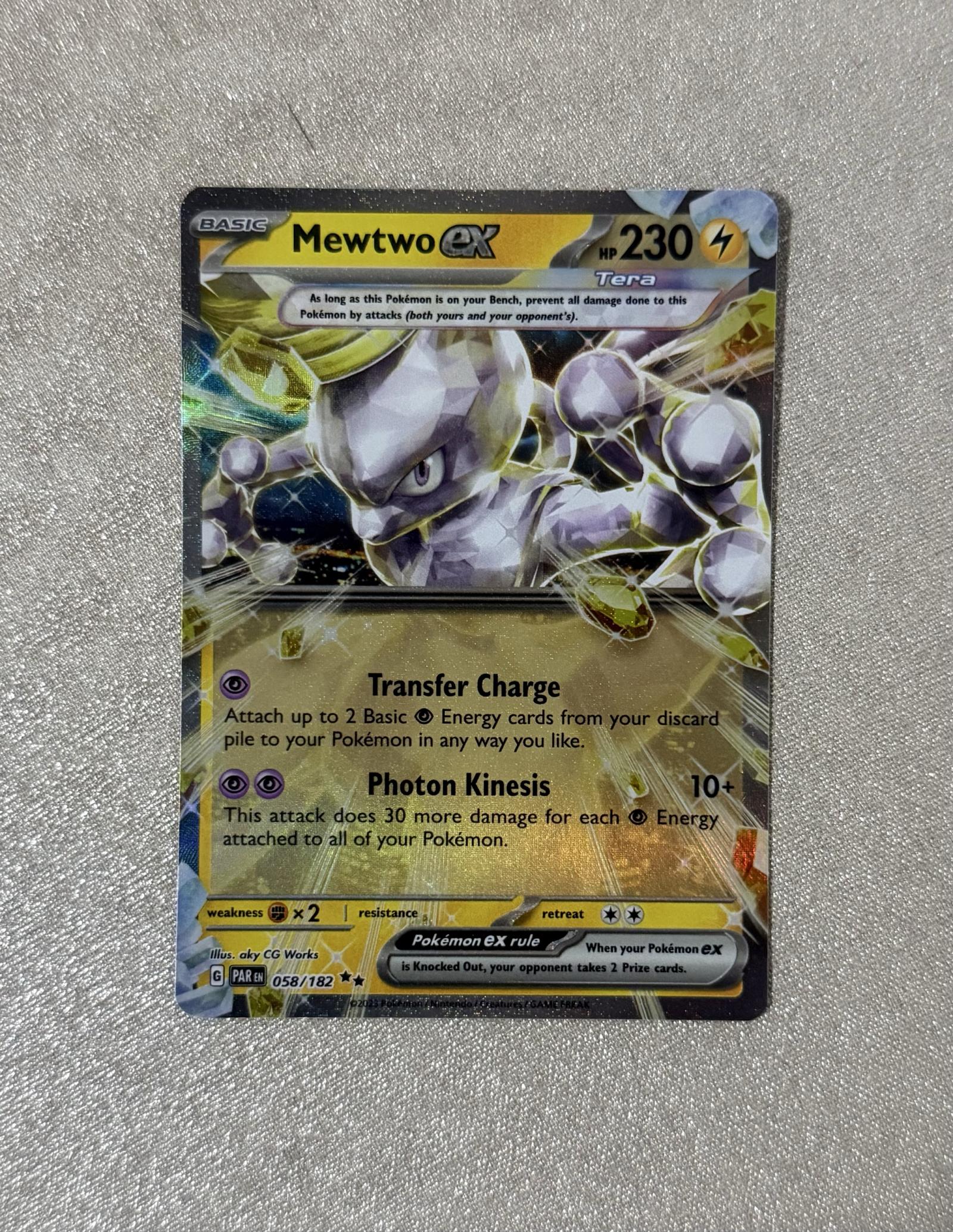 Mewtwo ex card number 058/182 from the Pokemon TCG set with card code PAR. Illustrated by dky CG Works. This is a holographic card featuring Mewtwo ex with 230 HP and Psychic type. It has the Transfer Charge and Photon Kinesis attacks. This card is playable in the meta and is foil.