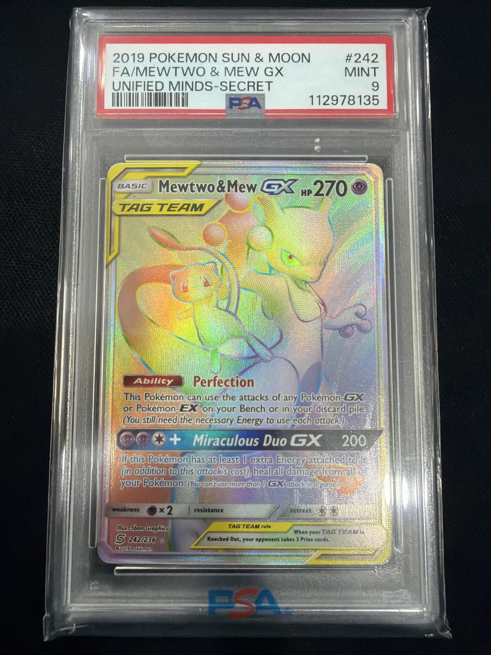 2019 Pokémon Sun & Moon Unified Minds Secret Rare Mewtwo & Mew GX card, collector number 242/236, illustrated by 5ban Graphics, graded PSA Mint 9. This foil card is playable in the meta and is highly sought after for collectors. Card code 112978135.